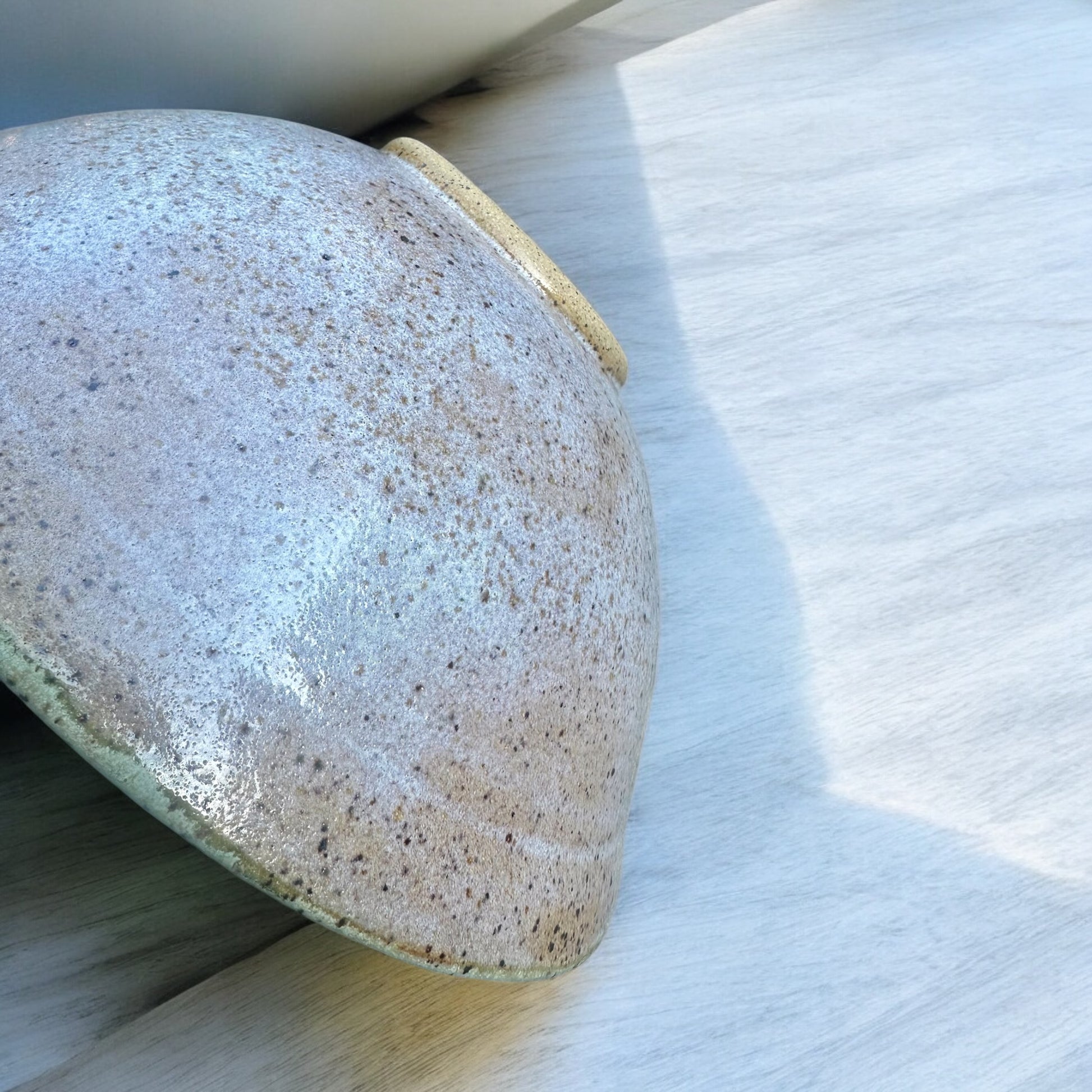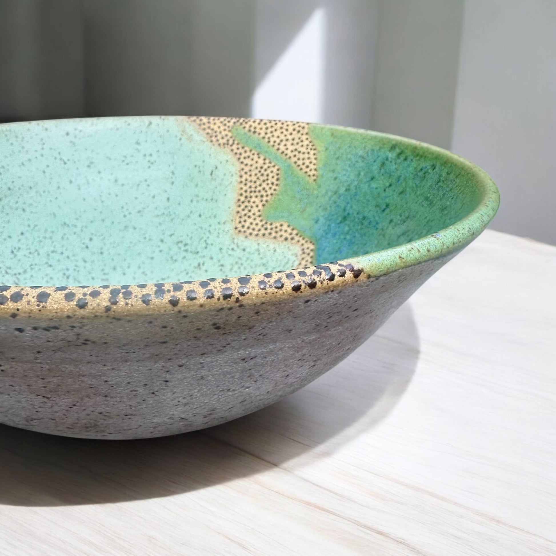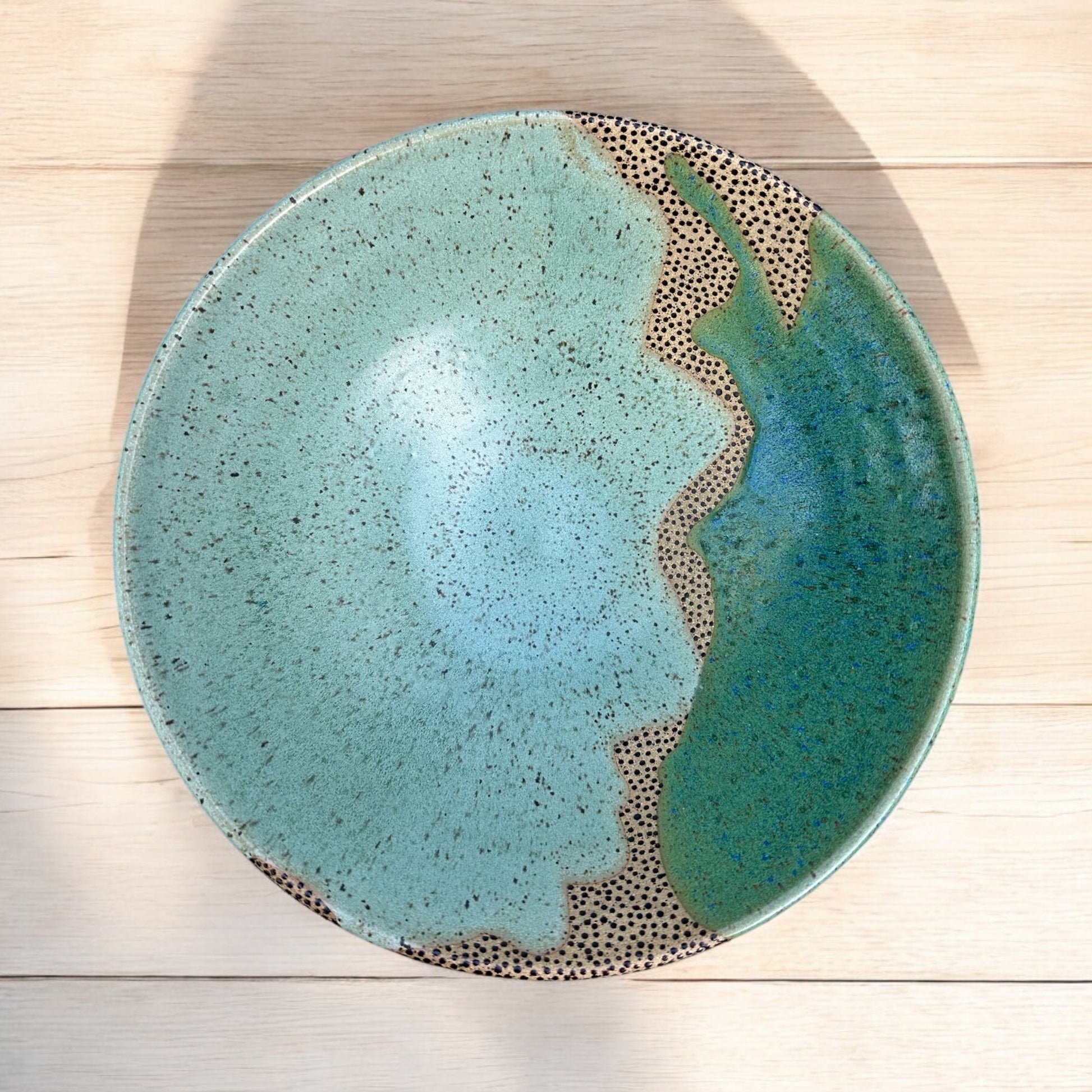 Wheel-thrown in speckled brown stoneware. Interior features organic design with Basque Green, Aqua and Black satin matte glazes. Exterior complements in Champagne gloss glaze.