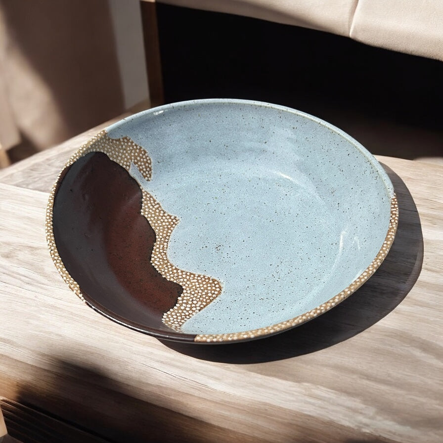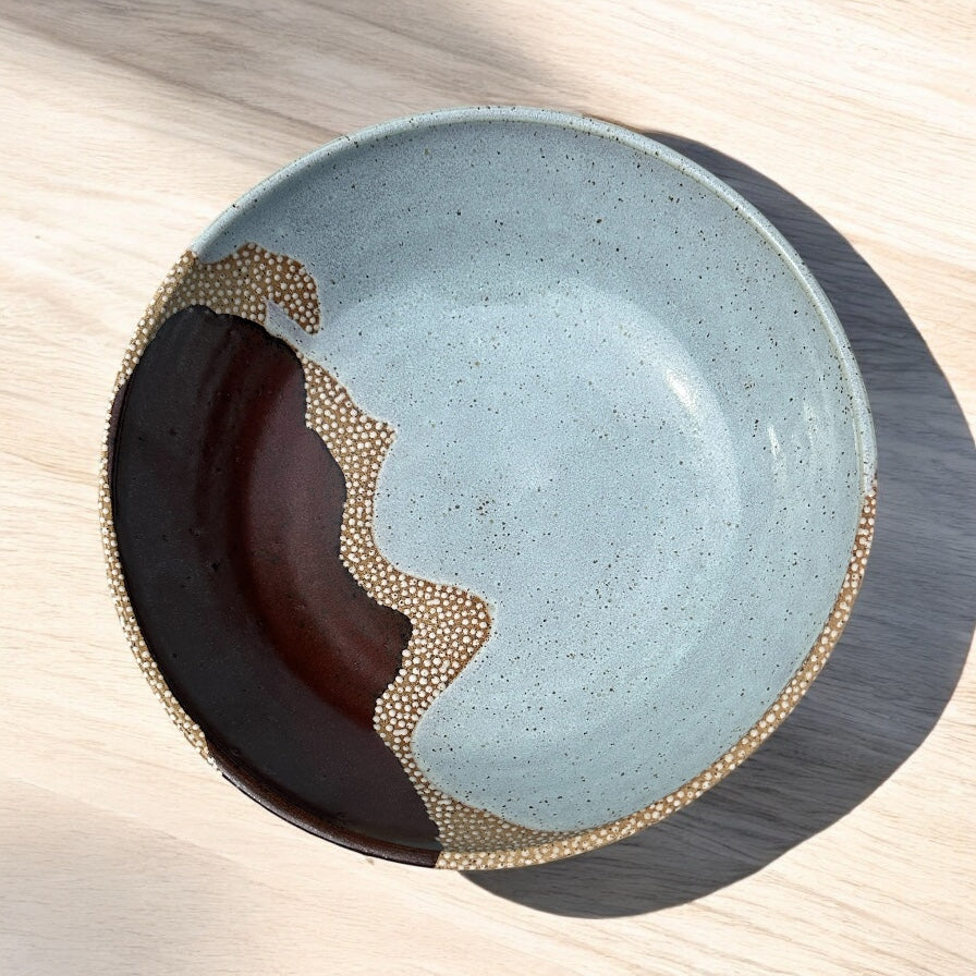 Wheel-thrown in speckled brown stoneware. Interior features organic design with Misty Blue, Cloud White and Jasper Brown shiny glazes. Exterior is finished in a Red Brown glaze.