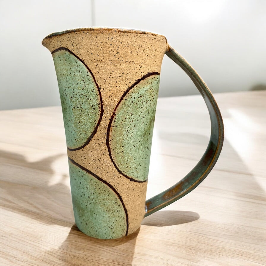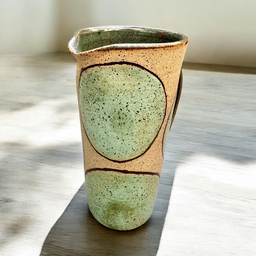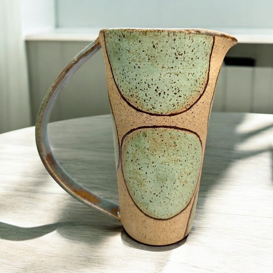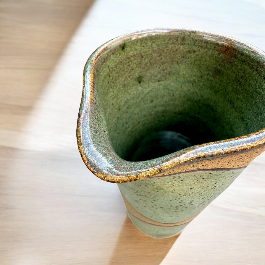 This pitcher is wheel-thrown and hand crafted in speckled brown stoneware. The exterior features a modern, whimsical design with Basque Green and Rich Brown glazes. Interior and swoop handle are enveloped in Tiger's Eye glaze. A beautiful, unique wedding/anniversary gift, or centerpiece with summer flowers to brighten up a table top.