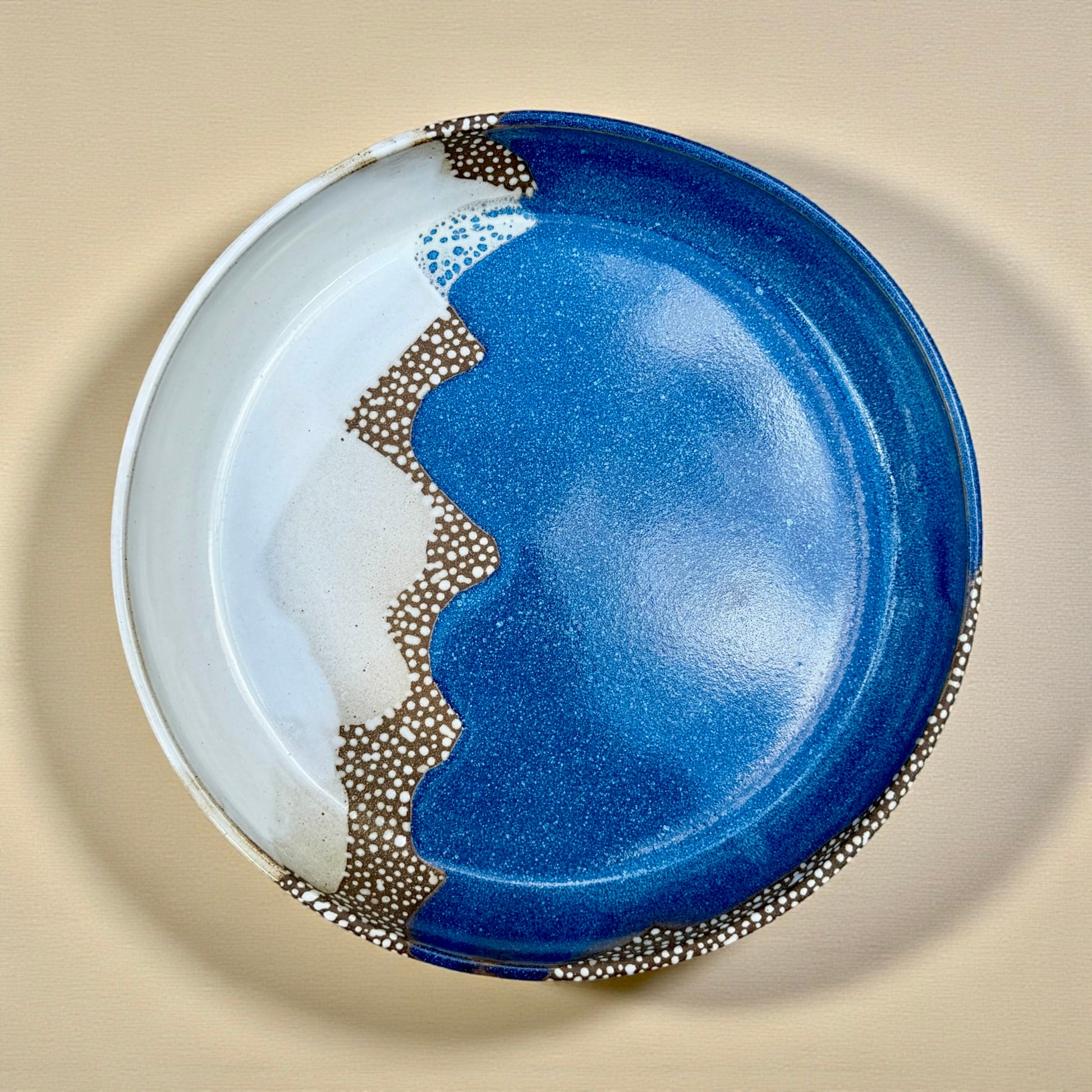 Wheel-thrown in speckled dark stoneware. This vibrant serving bowl features a landscape-inspired glaze design with rich blue and cloud white combined in an intricate pattern. It brings both function and artistry to the table—perfect for serving salads, pasta, or seasonal dishes.