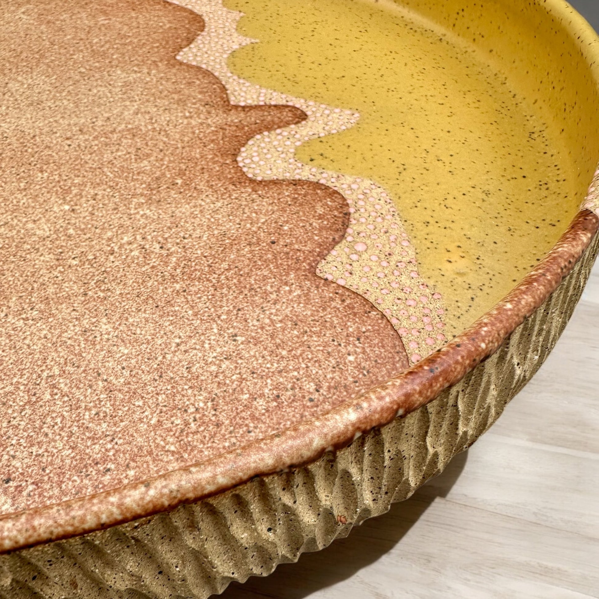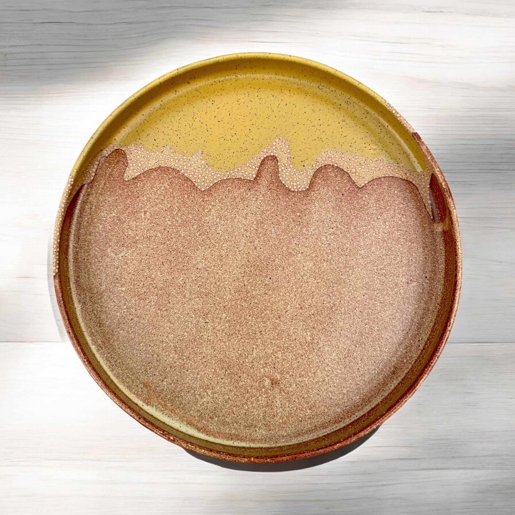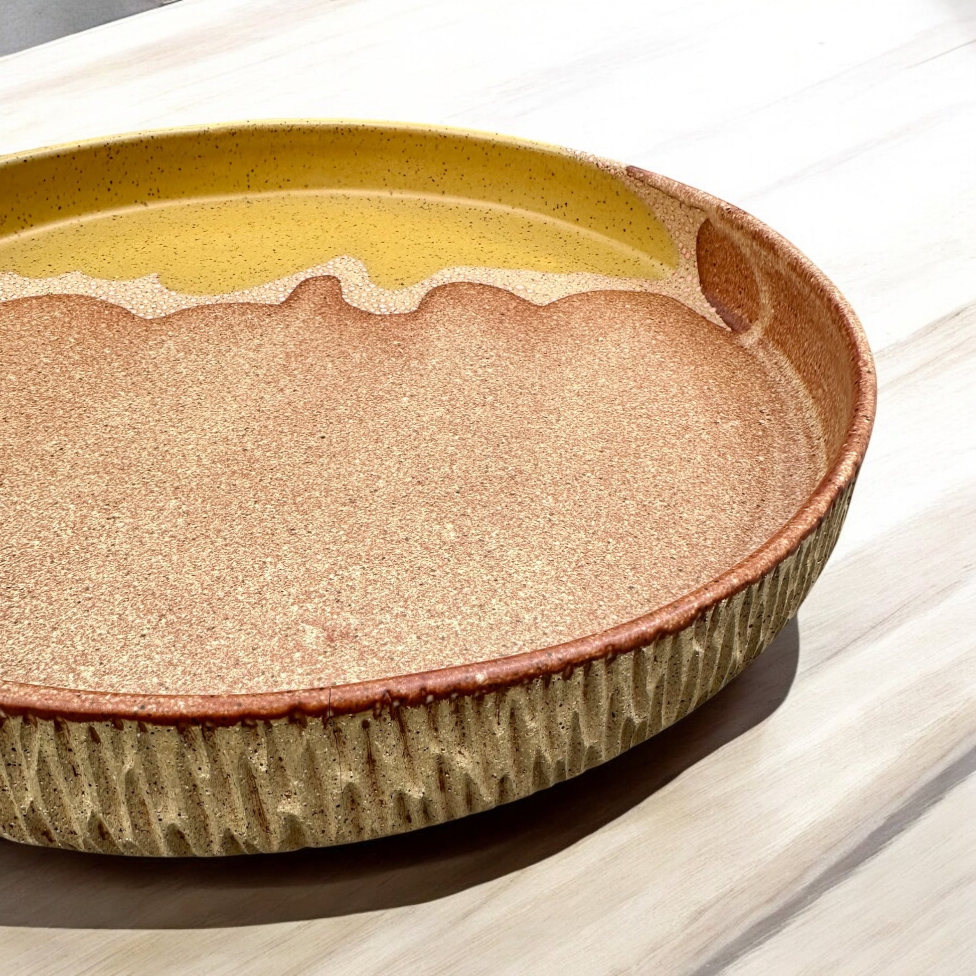 Wheel thrown tray set in speckled brown stoneware. Chestnut Brown and Corn Yellow glazes combine with Coral dots to create organic patterns. Exteriors are hand carved exposing the natural composition of the clay. Platter is sold with matching serving dish making this set perfect for serving guests and/or as a gift.