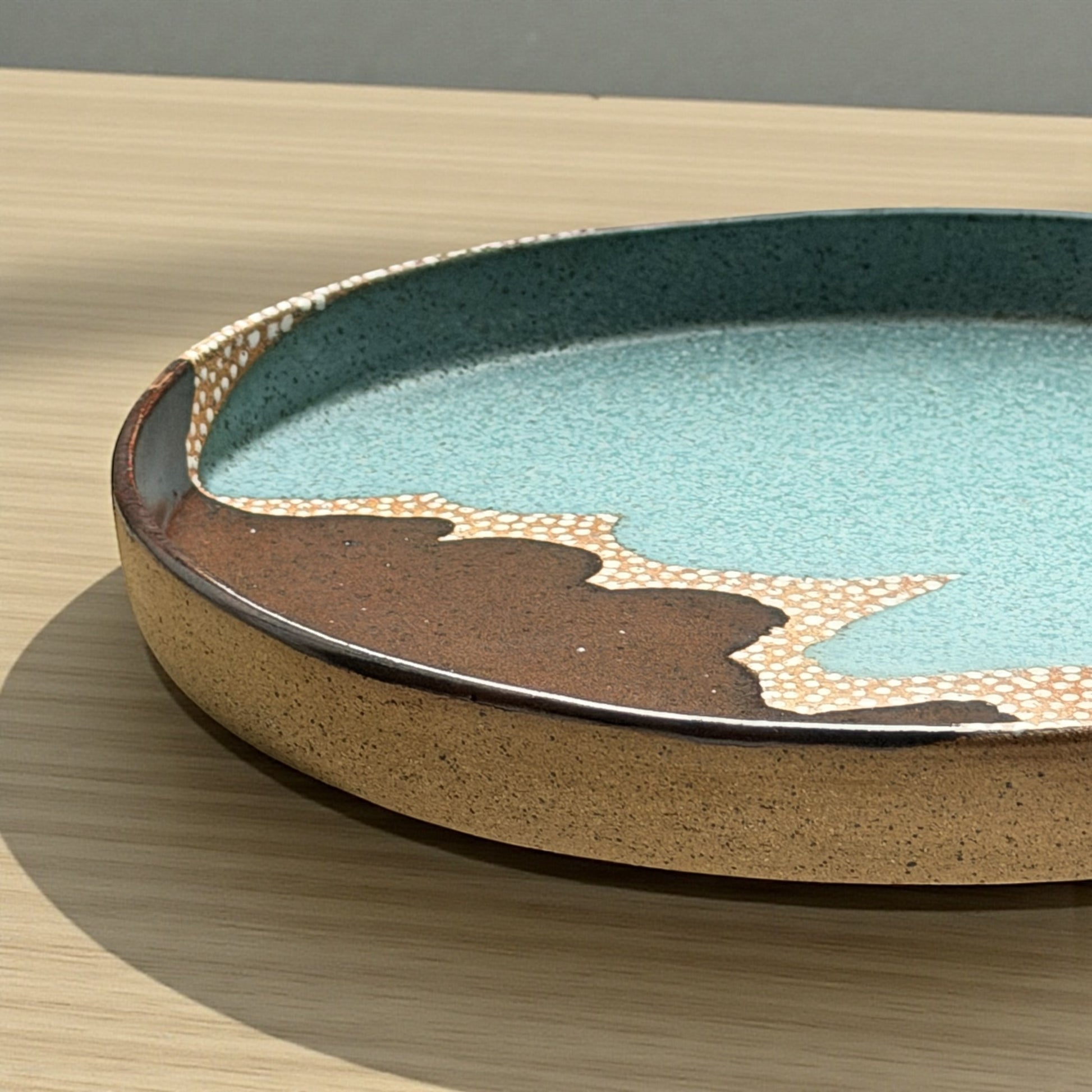 This unique stoneware serving plate features a striking contrast of textures and tones, where a smooth, earthy chocolate brown glaze meets a wash of cool turquoise. Wheel-thrown and finished with white glaze designs, this plate is both functional and sculptural—perfect for serving or displaying as a piece of art.