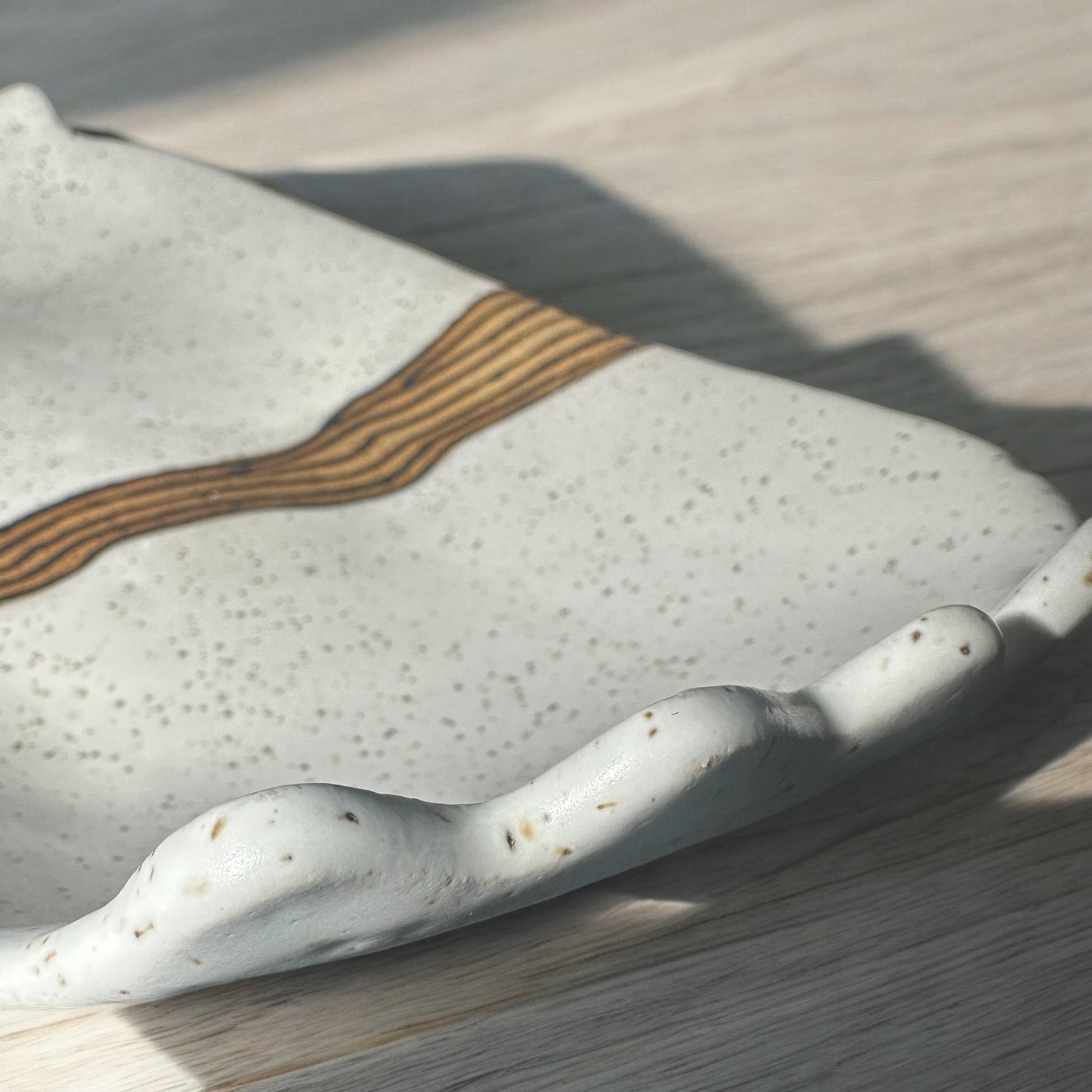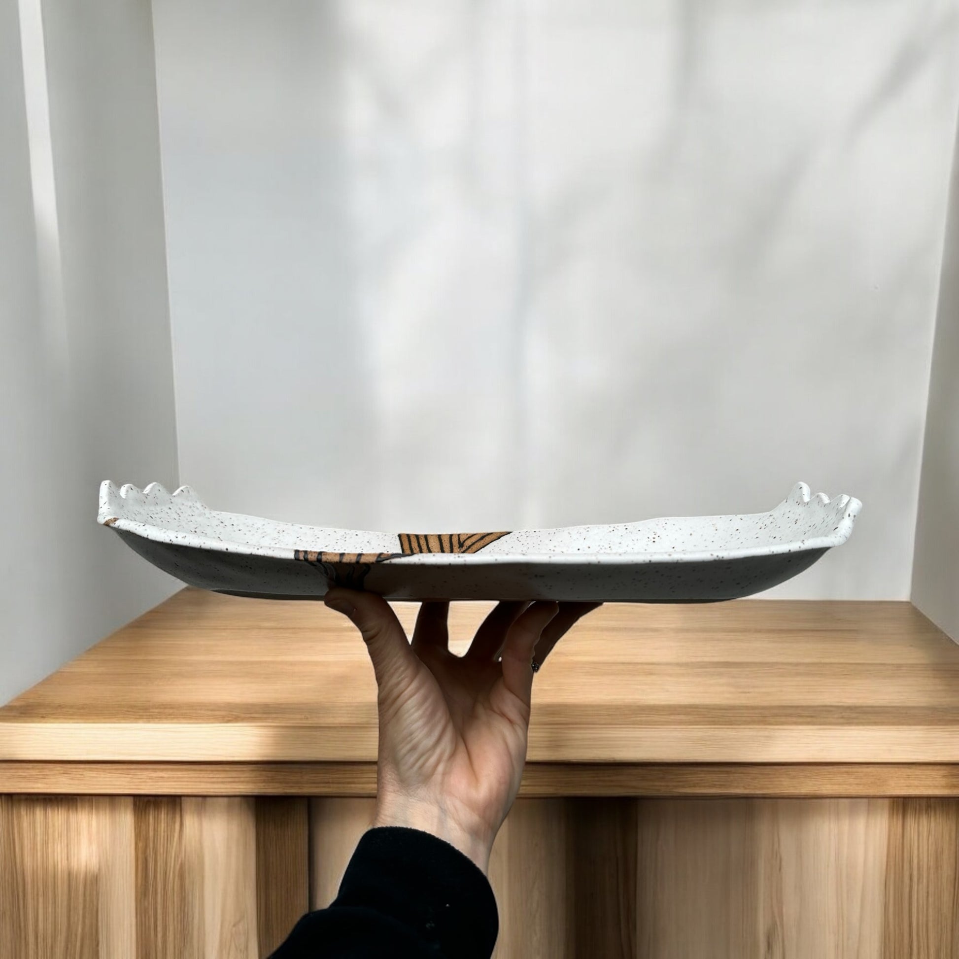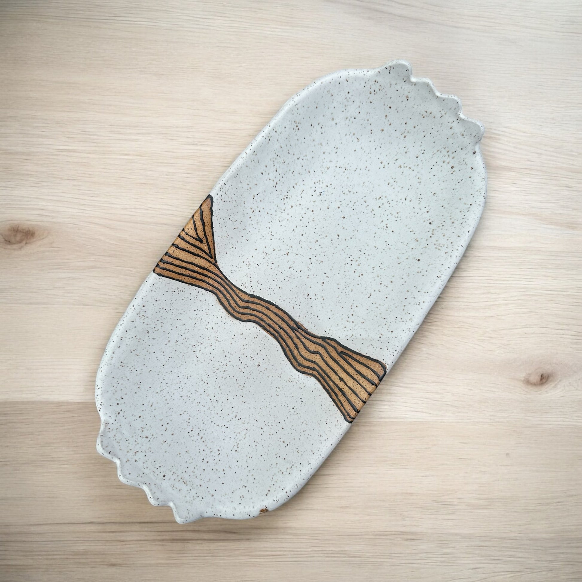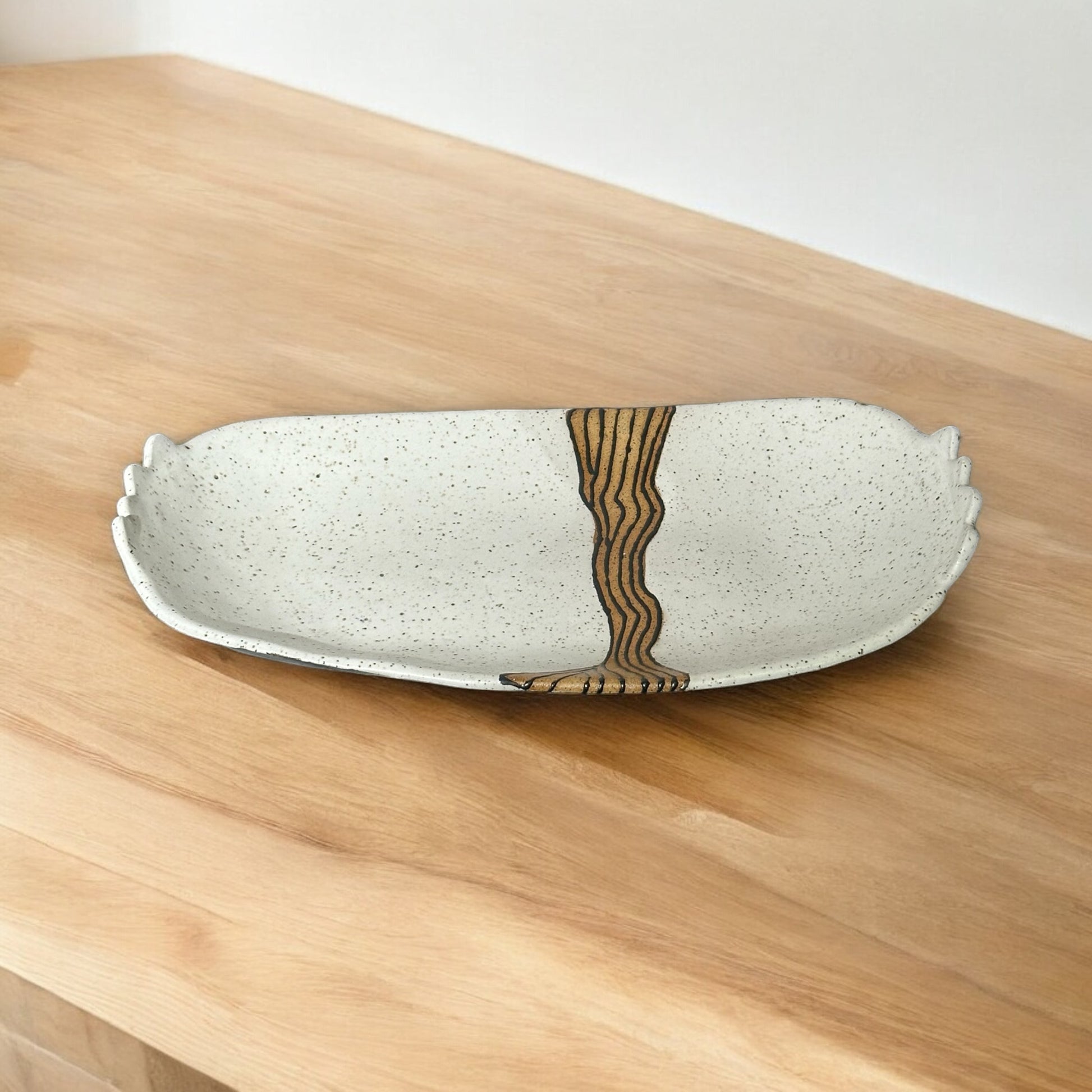 Hand-built in speckled brown stoneware. Cloud-White and Black-Matte glazes are hand-designed to create an arty modern oval tray. Design carries through interior and exterior. A unique and timeless table centerpiece or serving dish.