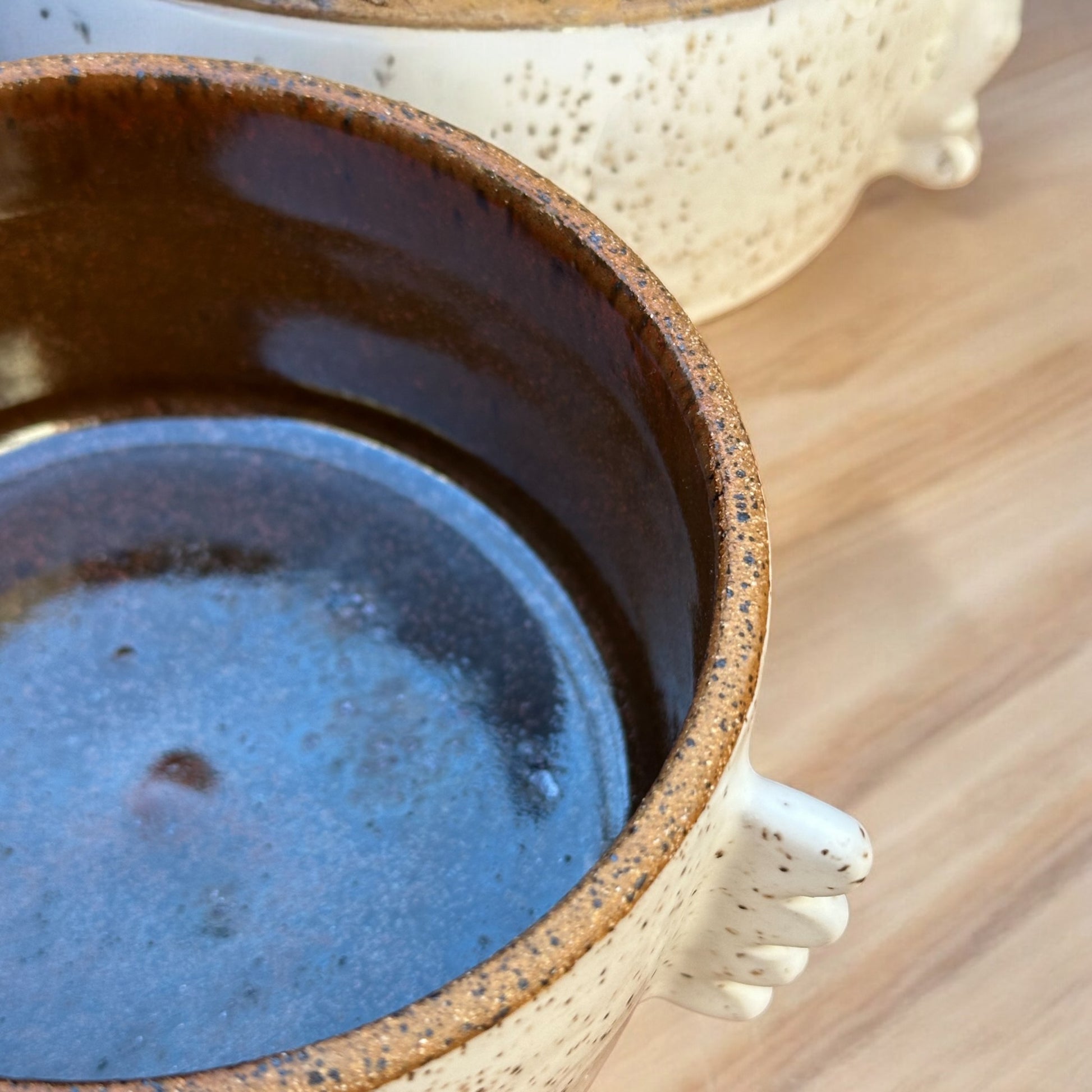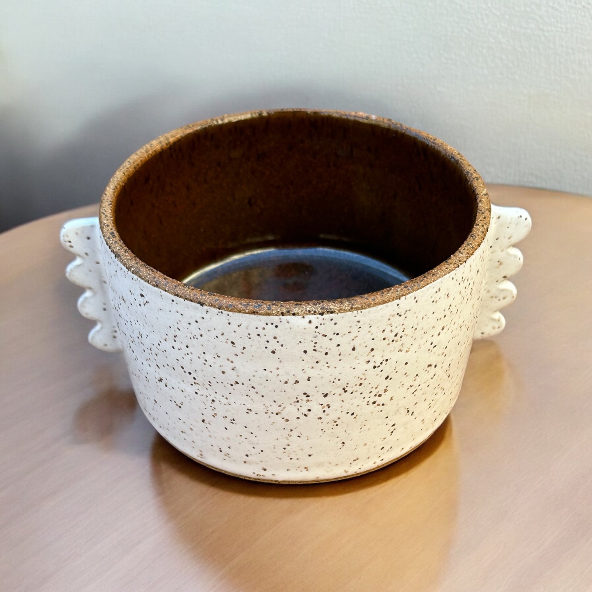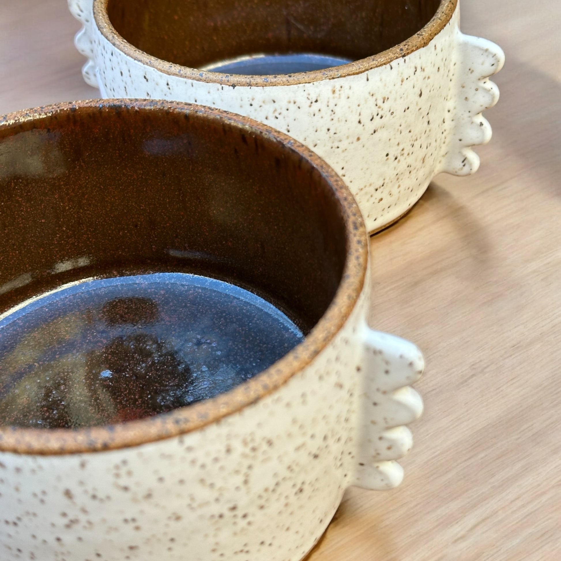 Wheel-thrown and hand-built in speckled brown stoneware. These bowls incorporate Chestnut glaze interior with Cloud White glaze exterior. And the whimsical handles add a little pizazz to your morning cereal or dinnertime salad.