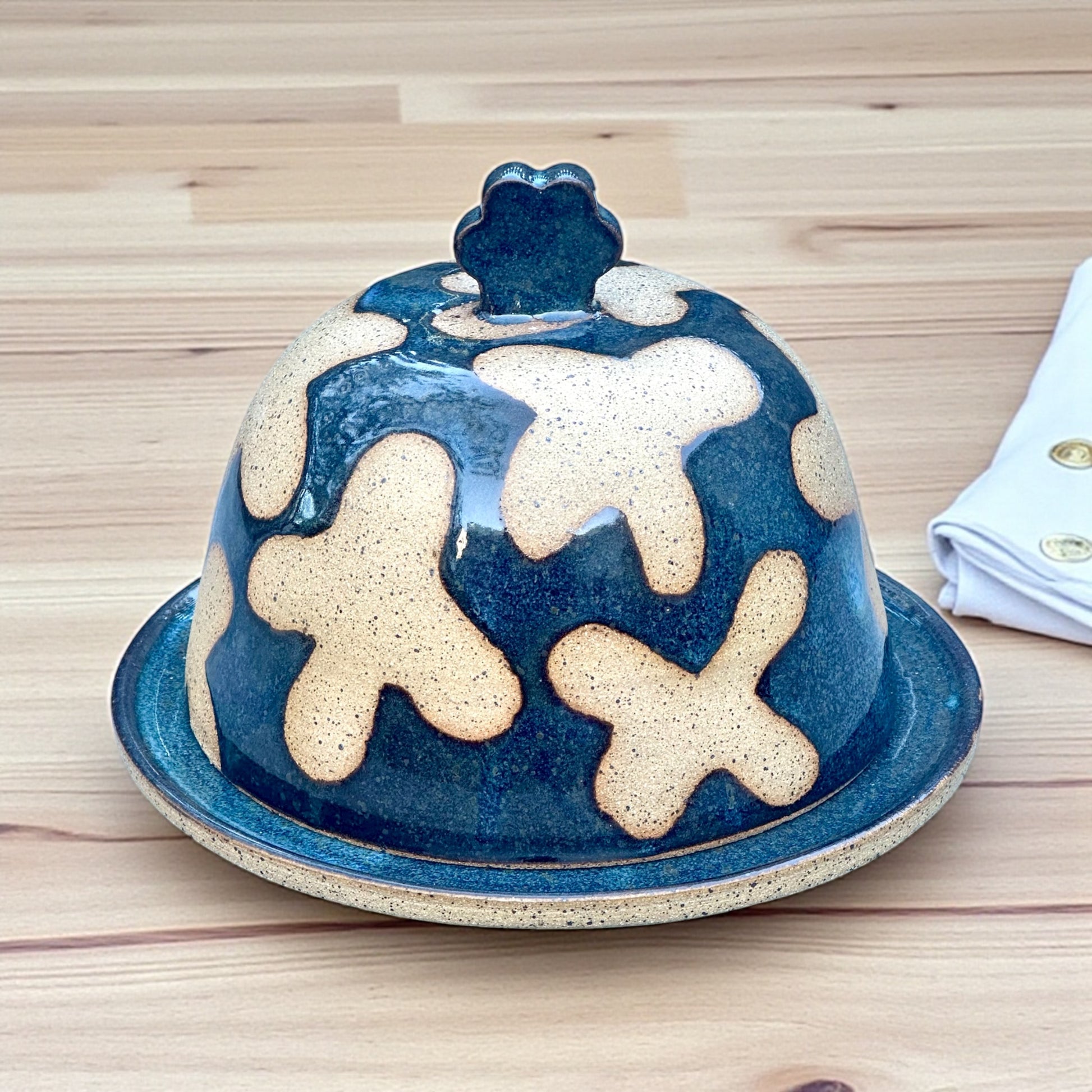 Wheel thrown and hand built in brown stoneware. The whimsical design on this one-of-a-kind cheese plate is decorative and functional. A perfect gift or a special something to grace your kitchen counter or table top.