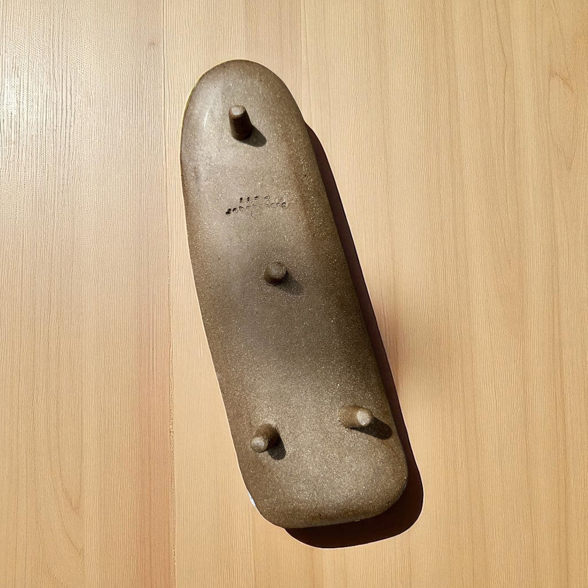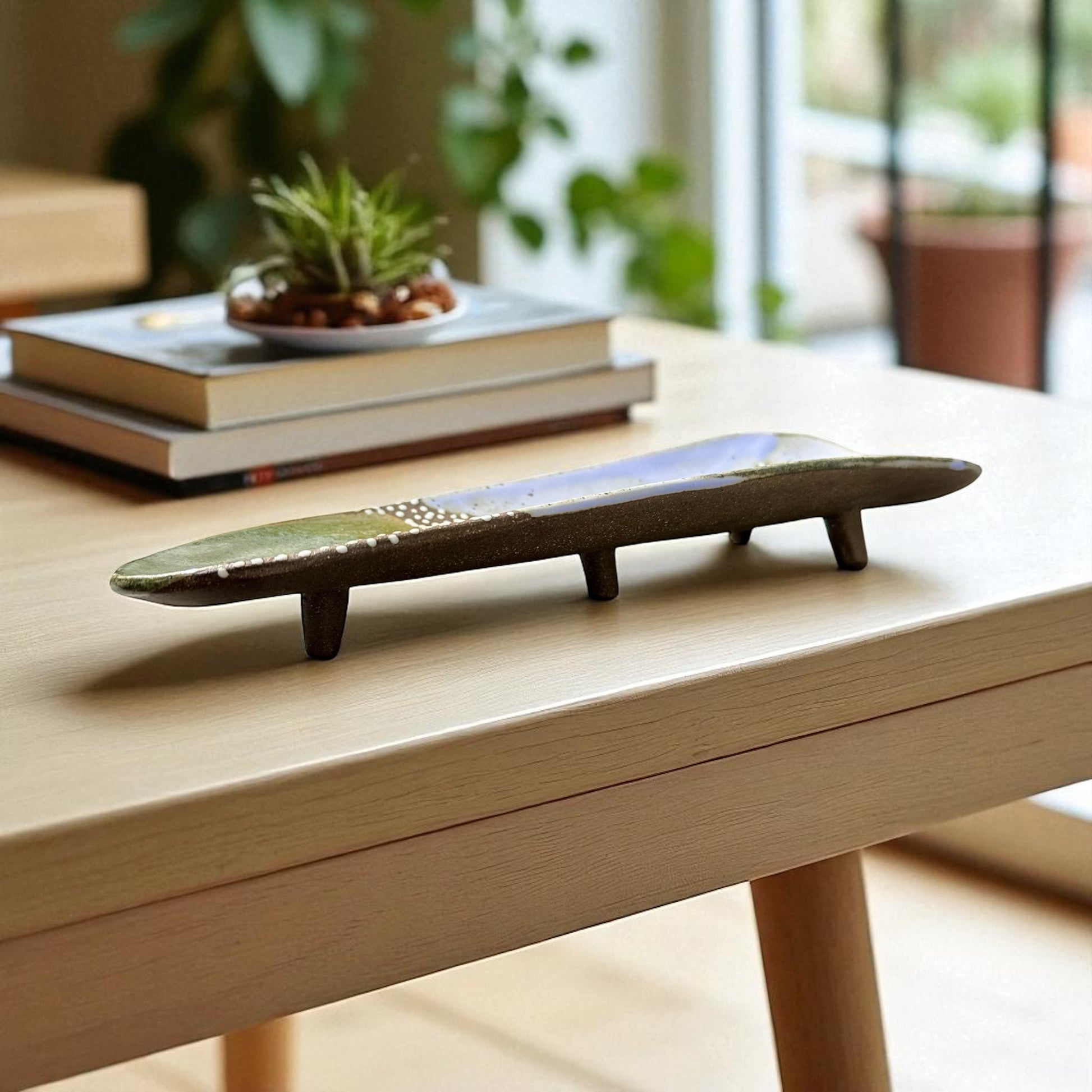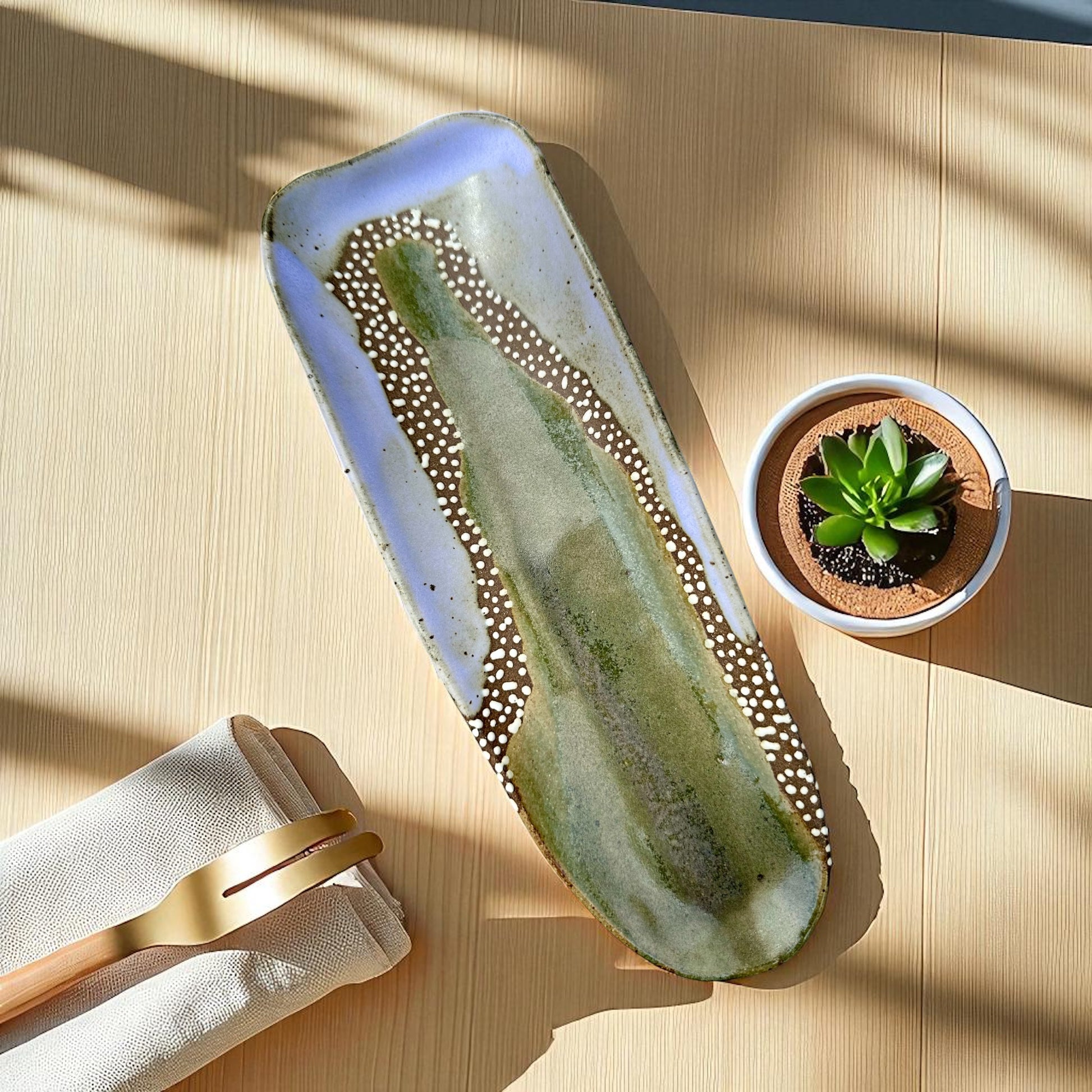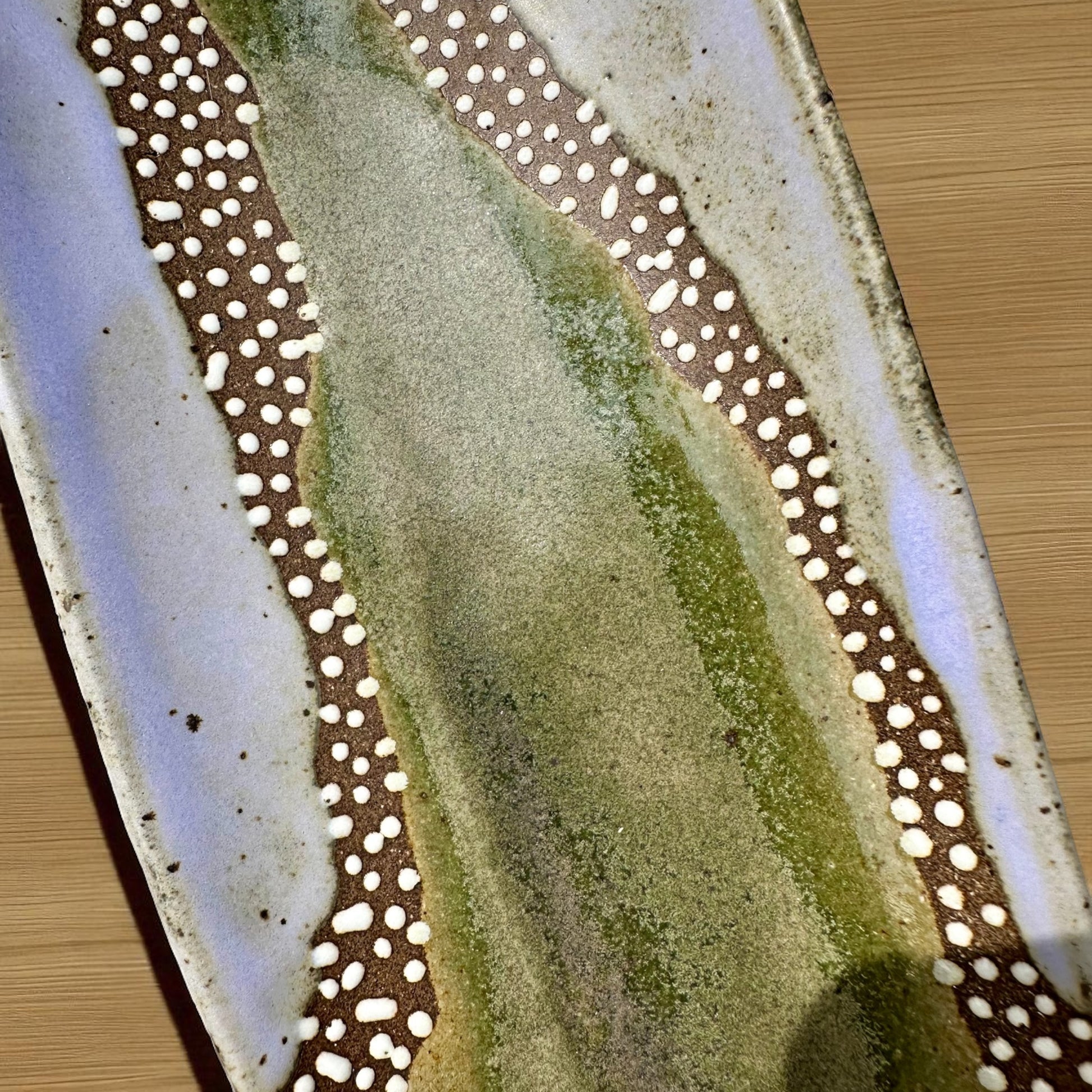 Hand crafted footed dish in speckled stoneware. A vibrant emerald green, pale violet and white dot design combine to create an organic pattern on this unique tray. A perfect decoration on a coffee table, bookshelf or console and/or can function as a nesting place for keys, jewelry and snacks.