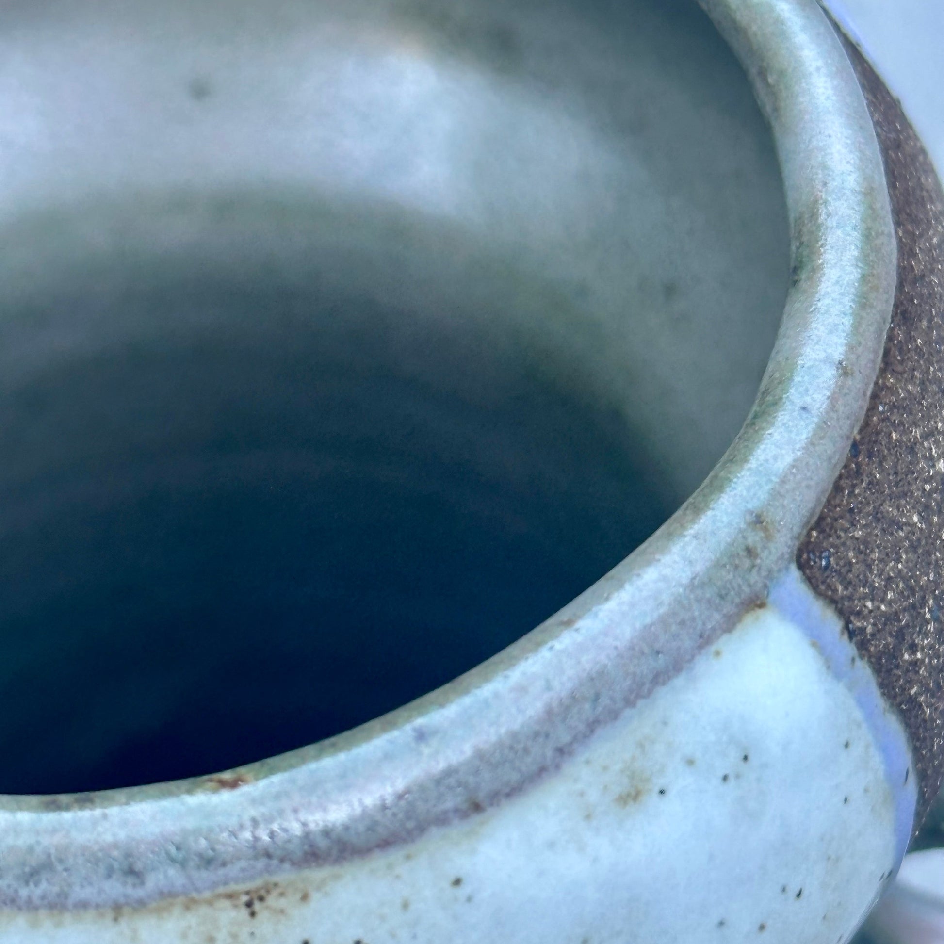 Wheel-thrown in dark speckled brown stoneware. This vase features hand painted white and lavender glaze designs on a mid-century modern shape. The green moss handles combine to create playful sculptural accents. A conversation piece whether displayed on its own or holding a few stems, this vase adds a modern, whimsical touch to any space.