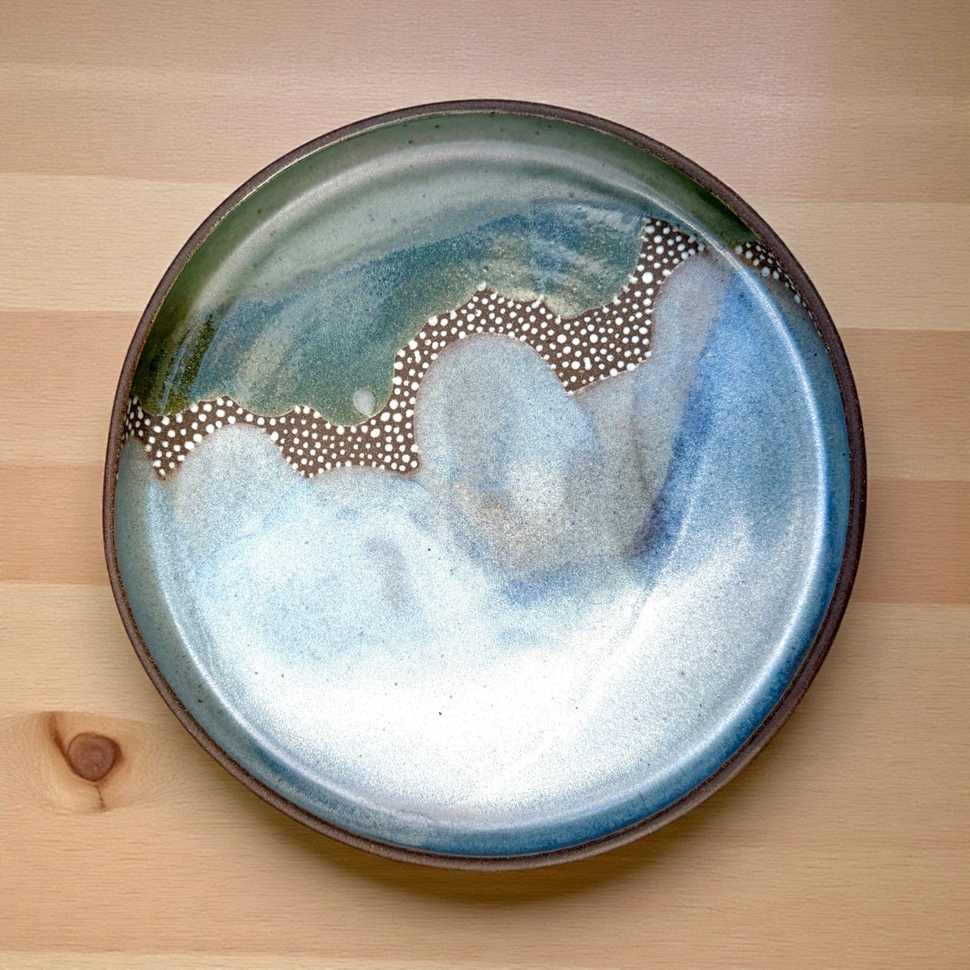 Wheel-thrown tray set in dark speckled stoneware. This one-of-a-kind serving set is inspired by the shifting edge between land and sea. Layers of oceanic blues and soft greens flow across the surface, meeting a carved and dotted texture that evokes sand and foam. Each piece nests together beautifully—perfect for serving or display.