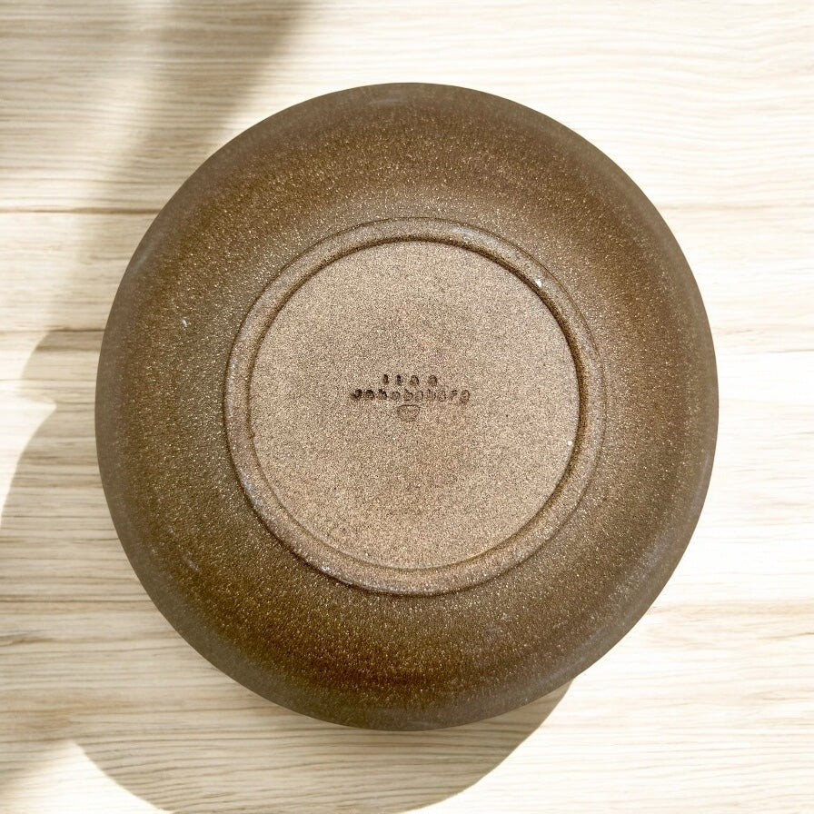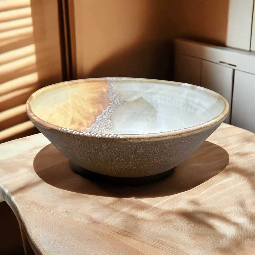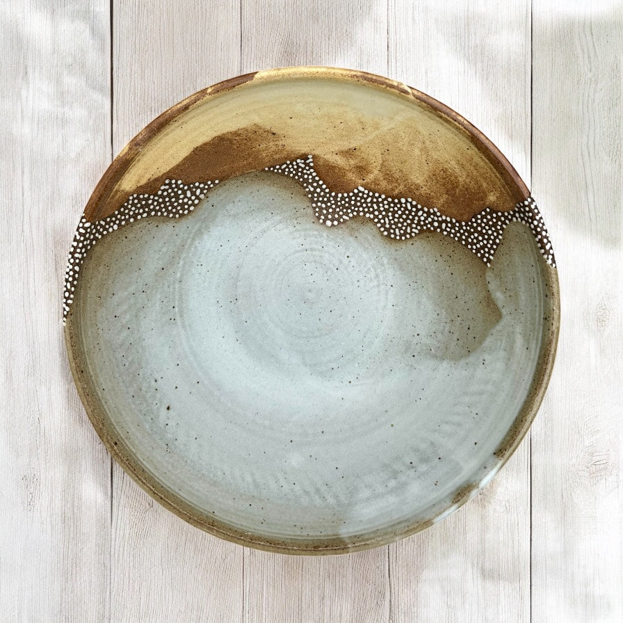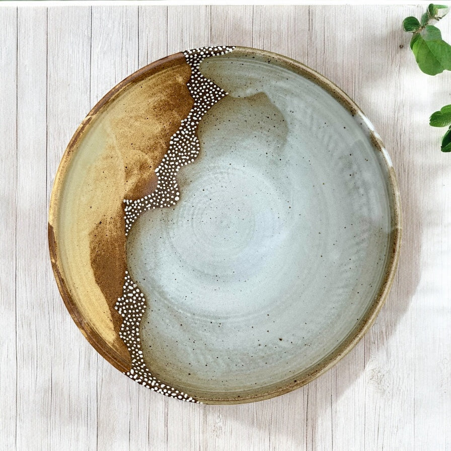 Wheel-thrown in speckled brown stoneware. The interior of this serving bowl features Soft Cream and Dusty Yellow satin matte glazes contrasted with White designs. The exterior is unglazed to expose the natural chocolate colored clay which carries through the center. Inspired by shifting landscapes and shoreline contours, the design evokes both movement and stillness.