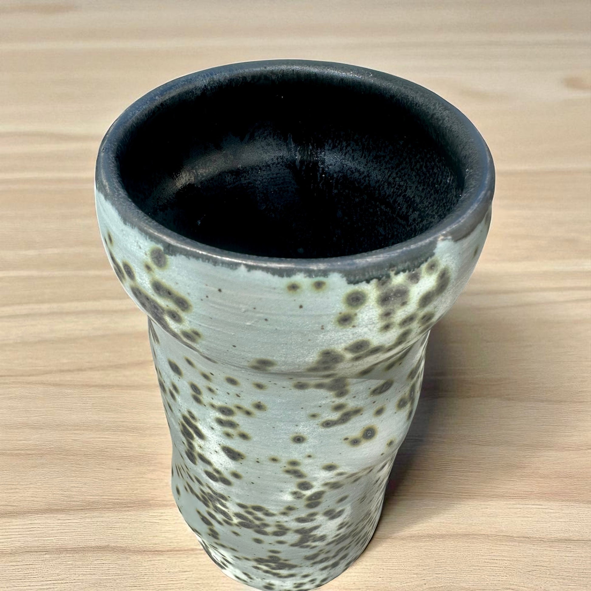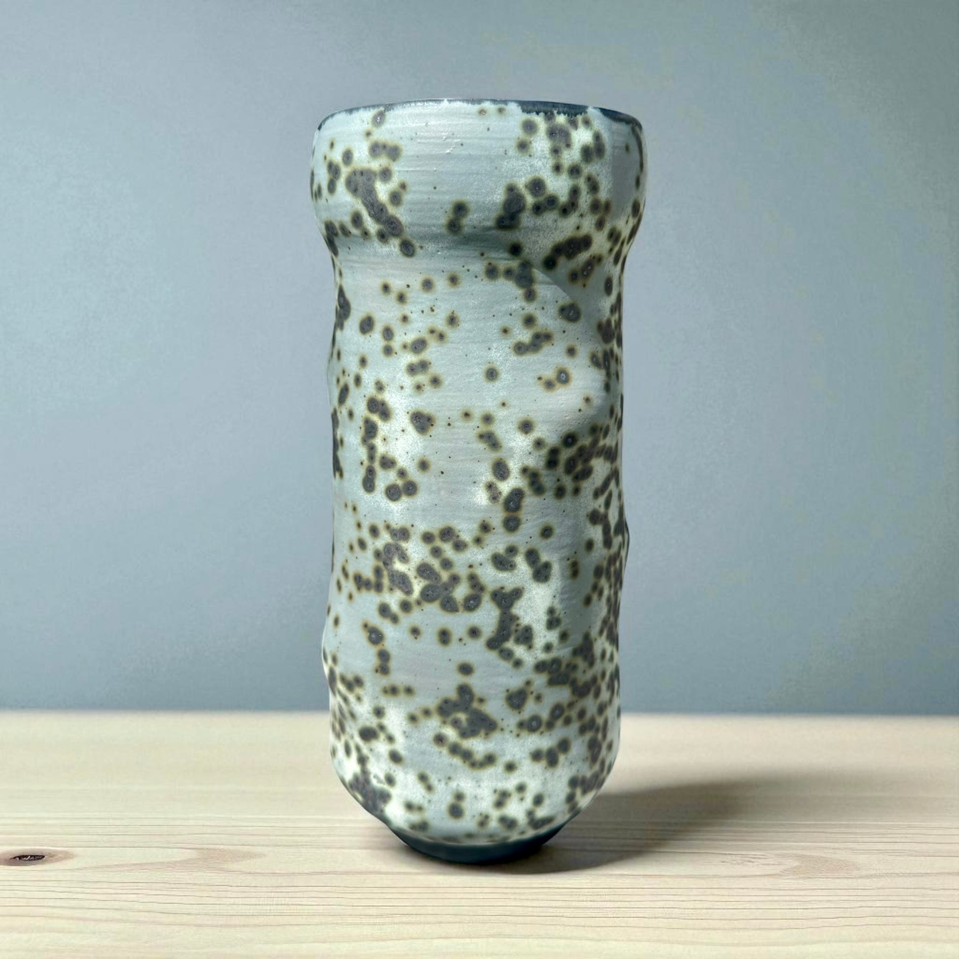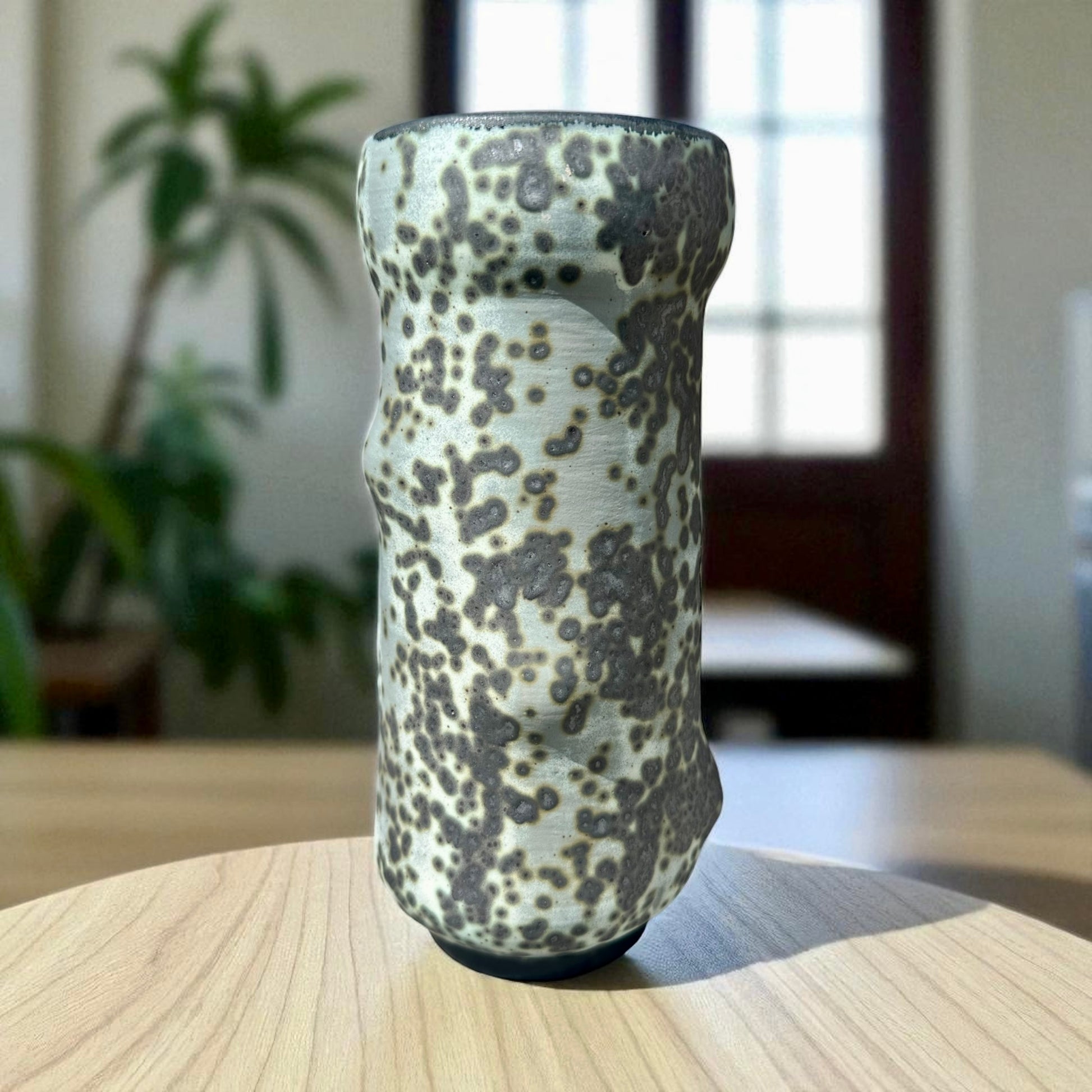 Wheel-thrown in porcelain stoneware. This vase features an organic silhouette with subtle curves and natural indentations that make it both uniquely sculptural and functional. The surface is finished in a creamy matte glaze with rich brown, green speckling, creating a dynamic, almost volcanic texture. Its tall, cylindrical form makes it perfect for displaying fresh flowers, dried stems, or as a sculptural statement piece on its own.