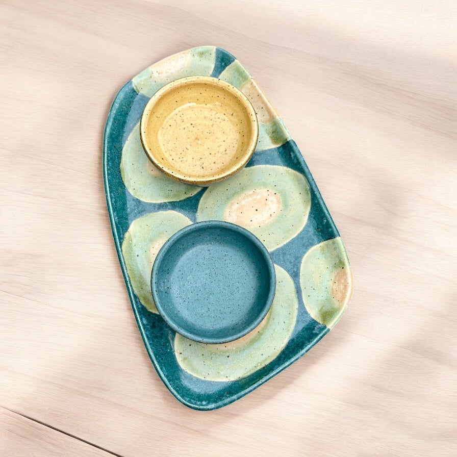 Hand-built tray set crafted from white stoneware. Teal Agate, Yellow and Basque Green glazes combine to create a vibrant, modern aesthetic. Two accompanying dishes are perfect for olives, dips and other savory snacks.
