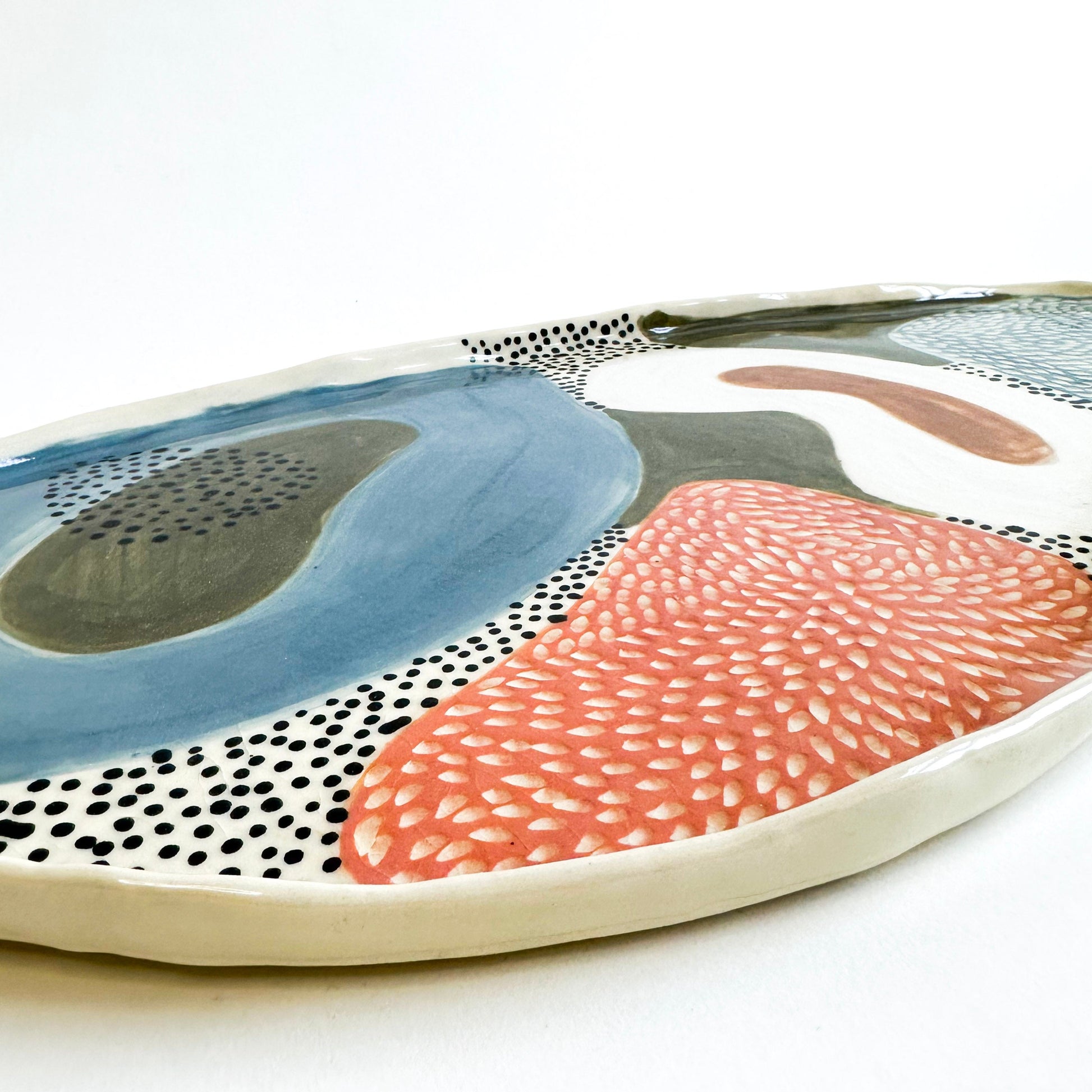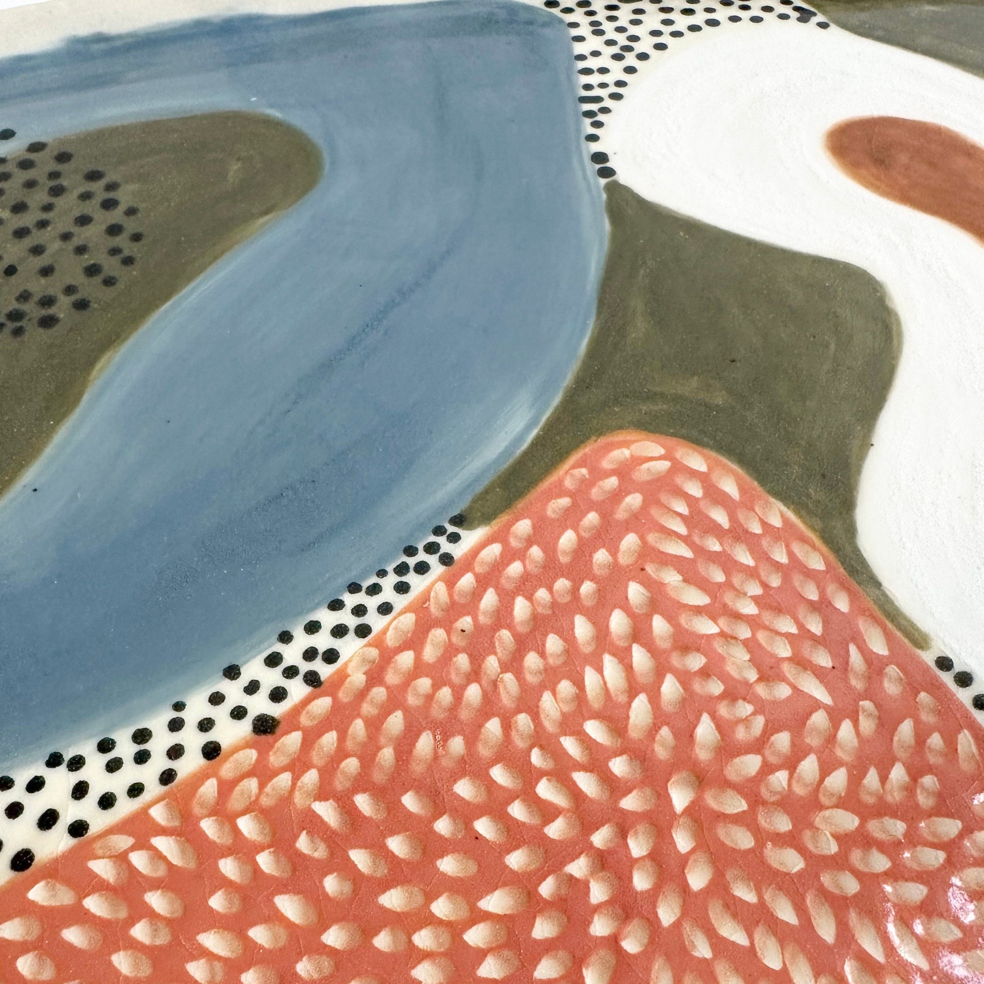 Hand-built tray in white stoneware. Pastel-colored underglazes and Sgraffito detailing create a unique, modern design with clear gloss finish.