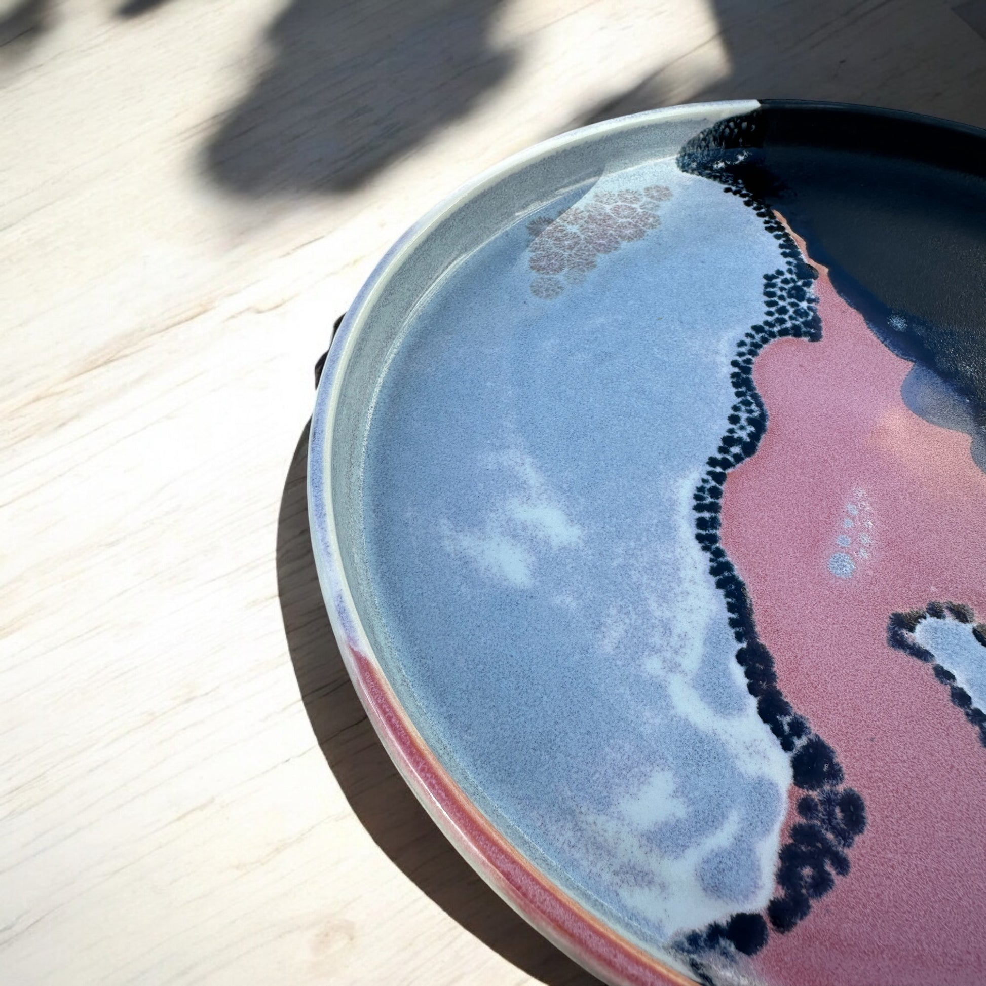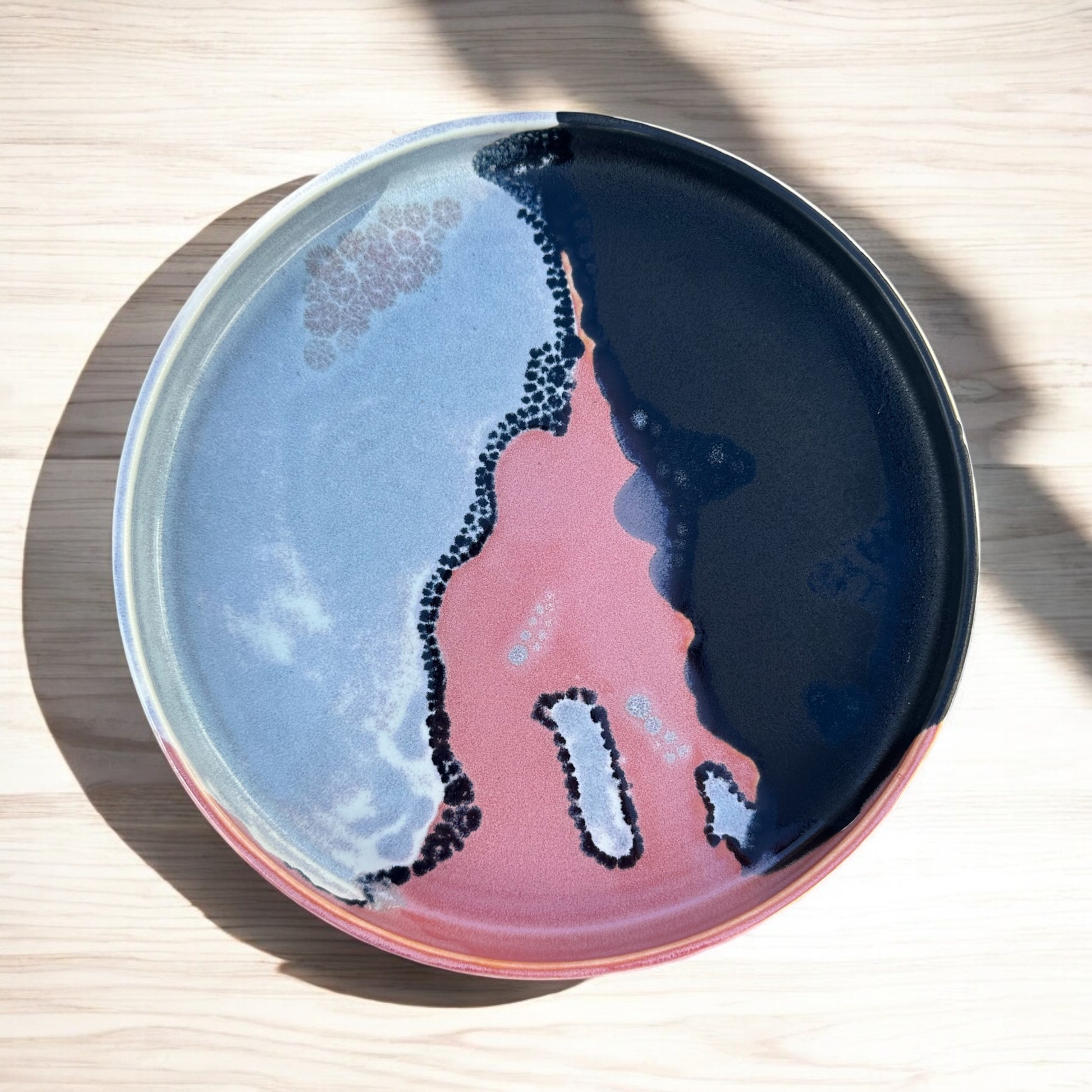 Wheel thrown in porcelain stoneware. Raspberry, Sky Blue and Black Matte glazes coalesce to create a unusual design reflections. This plate is a perfect table centerpiece, emanating vibrant colors and intricate patterns.