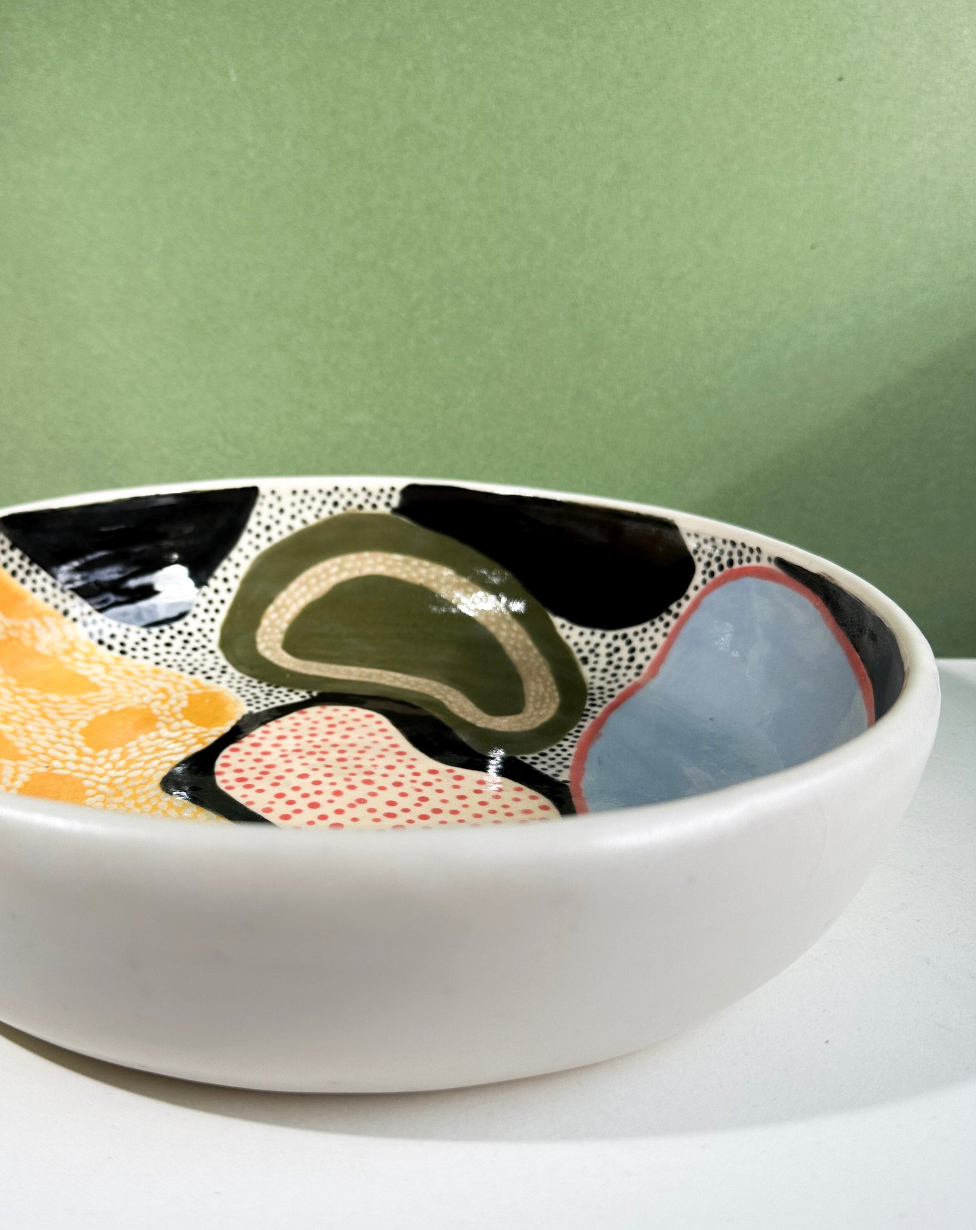 Wheel-thrown serving in white stoneware. Vibrant hand-designed underglazes with Sgraffito detailing under clear glaze finish. Exterior is matte white glaze.