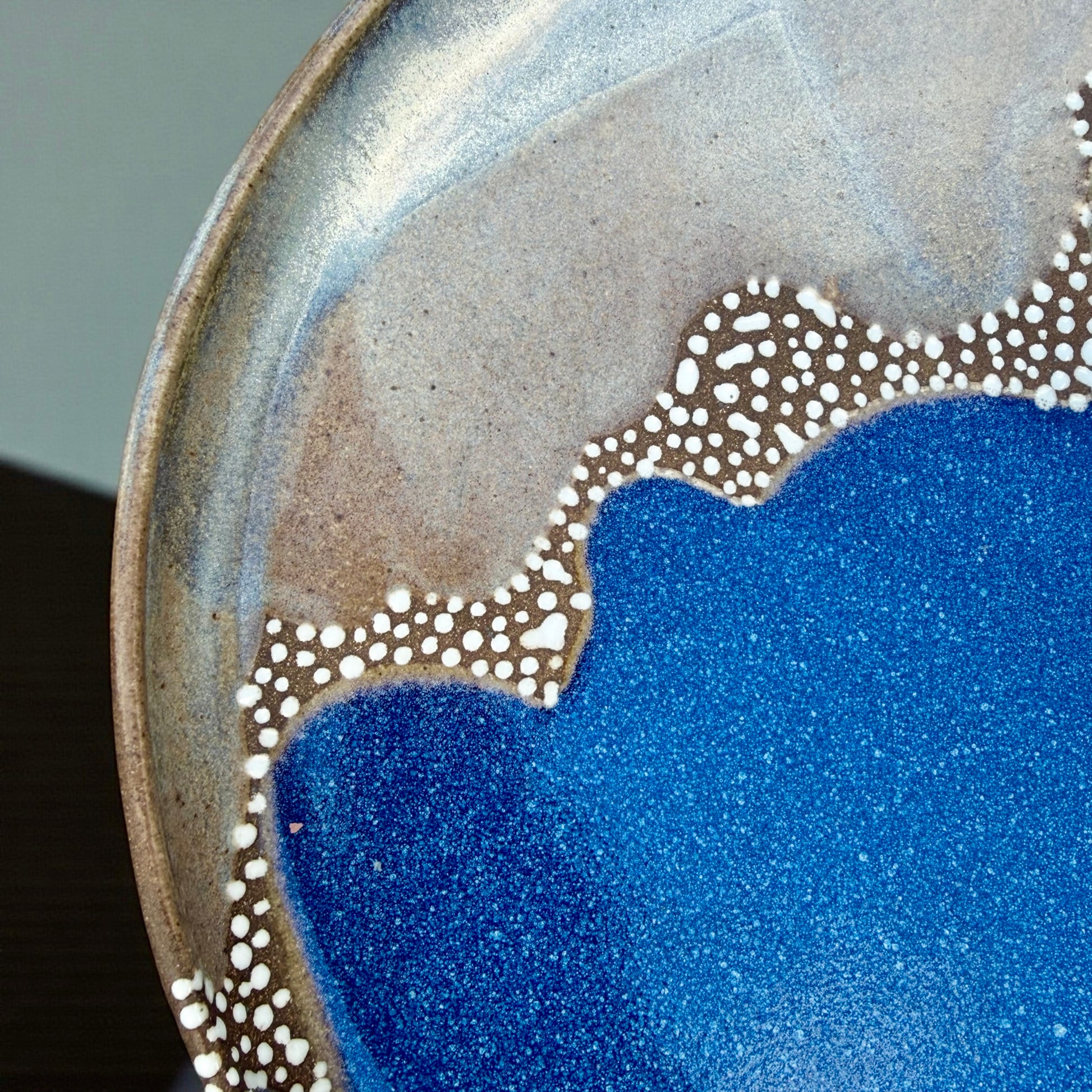 Wheel-thrown in speckled dark stoneware. Two blue glaze hues intersect with a hand painted cloud white design to create a motion-inspired pattern. The outside is unglazed, revealing the natural sand-like clay texture. This plate is perfect for serving crudités, cheese and crackers and other items at holiday gatherings.