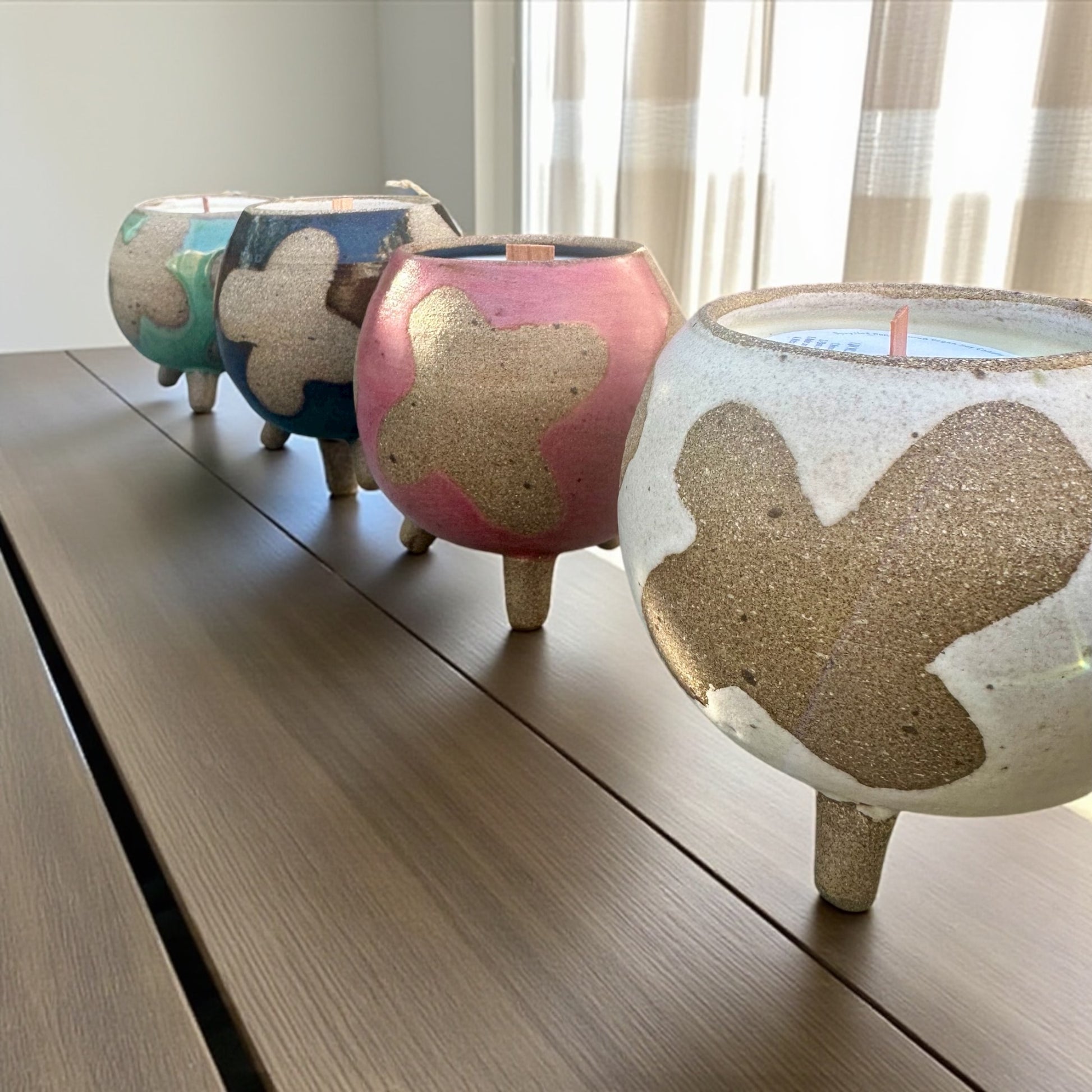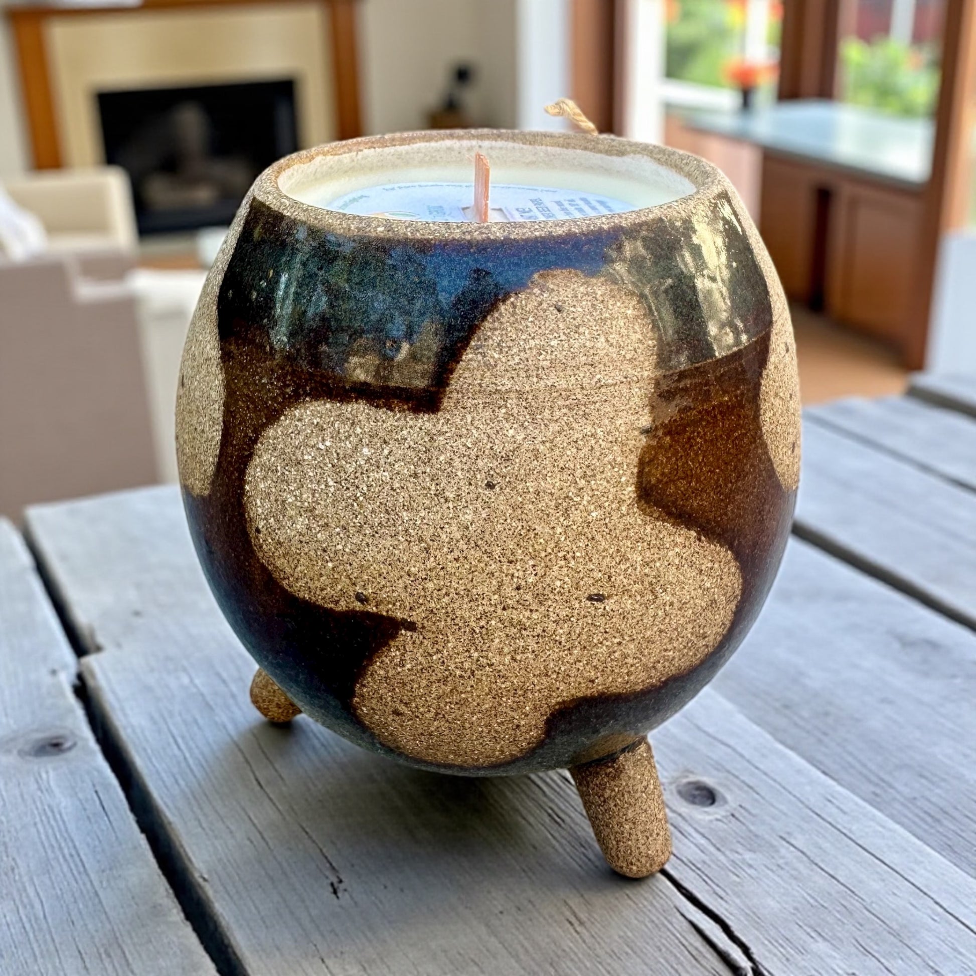 Wheel-thrown and hand-built in speckled brown stoneware. Each tripod candle is hand designed with glaze; professionally filled by Glow To Grow Candles; and includes a seed paper to transform into planter when the candle are finished.