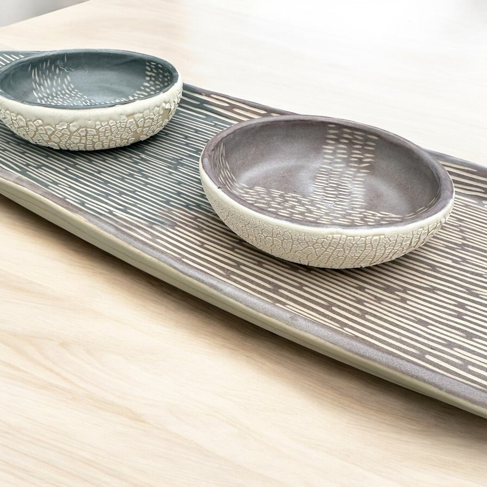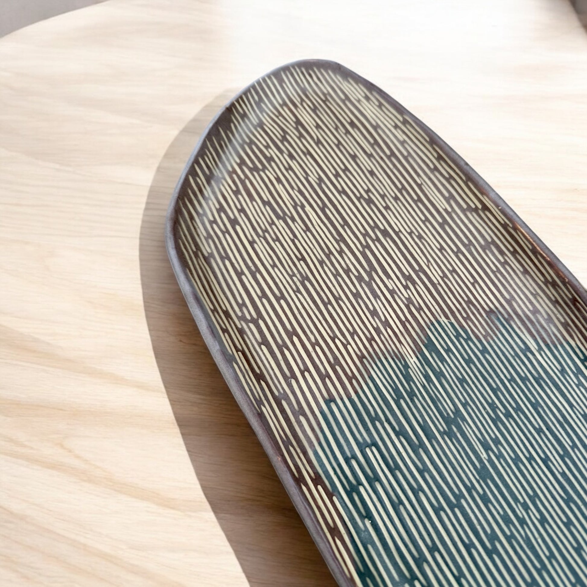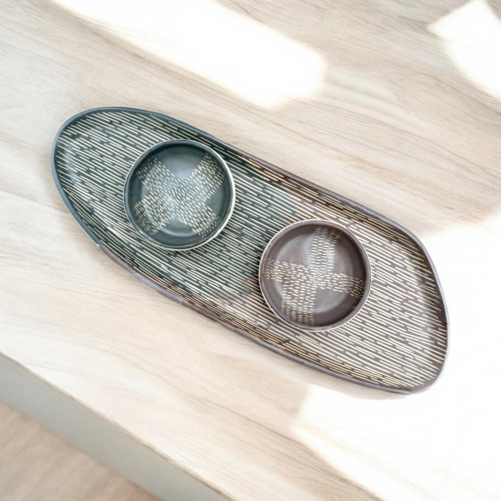 Hand-built tray crafted from white stoneware. Featuring Sgraffito etchings over Slate Gray and Chestnut Brown slip (liquid clay) designs, finished with a matte clear glaze for a soft, polished look. Perfect as a serving dish, cheese plate, or thoughtful gift.