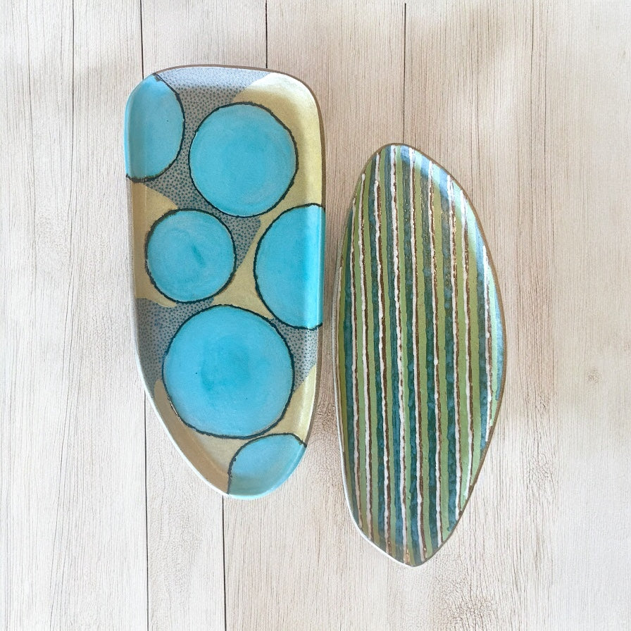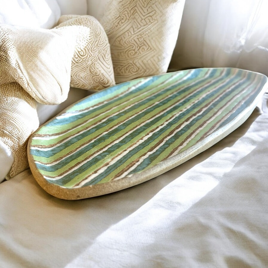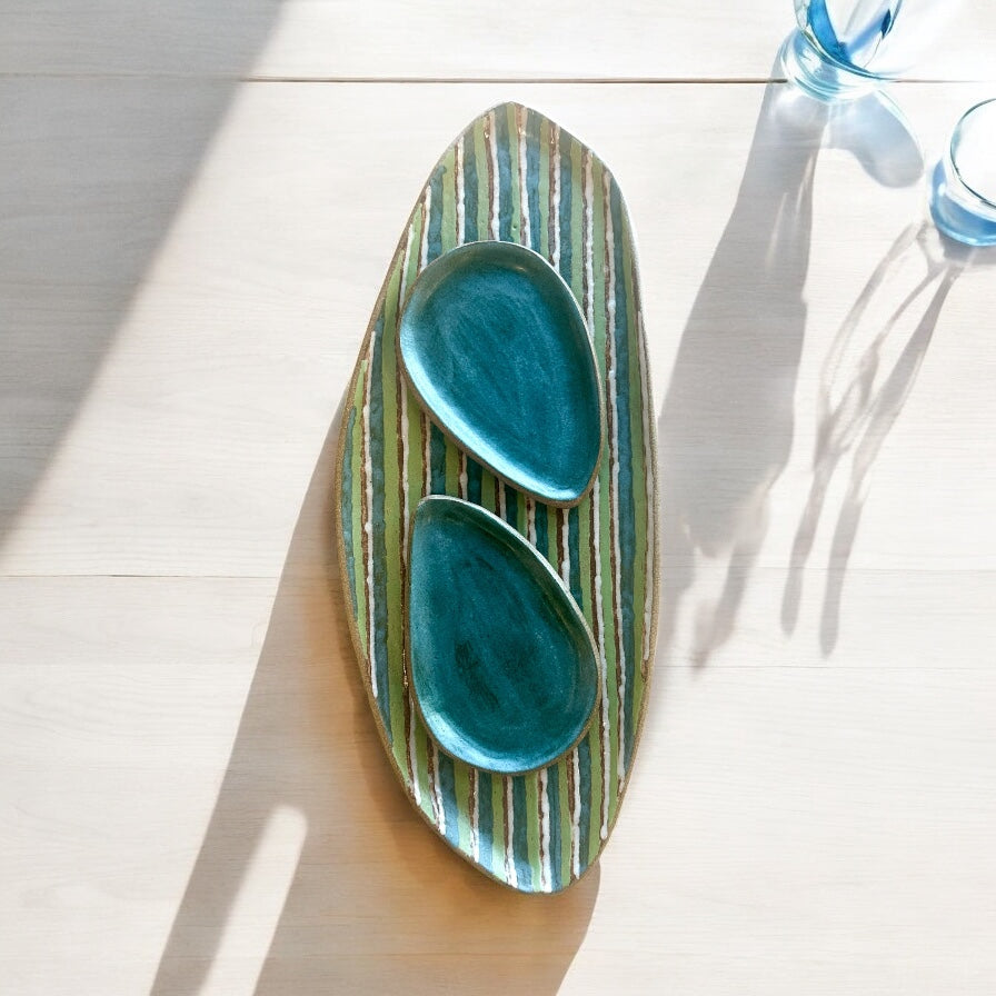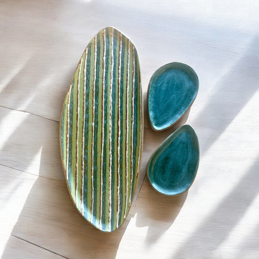 Hand-built tray set crafted from speckled stoneware. Inspired by Moroccan tiles, this tray set combines rich colored satin matte glazes in a modern striped design. Perfect as a serving dish, cheese plate, or thoughtful gift.