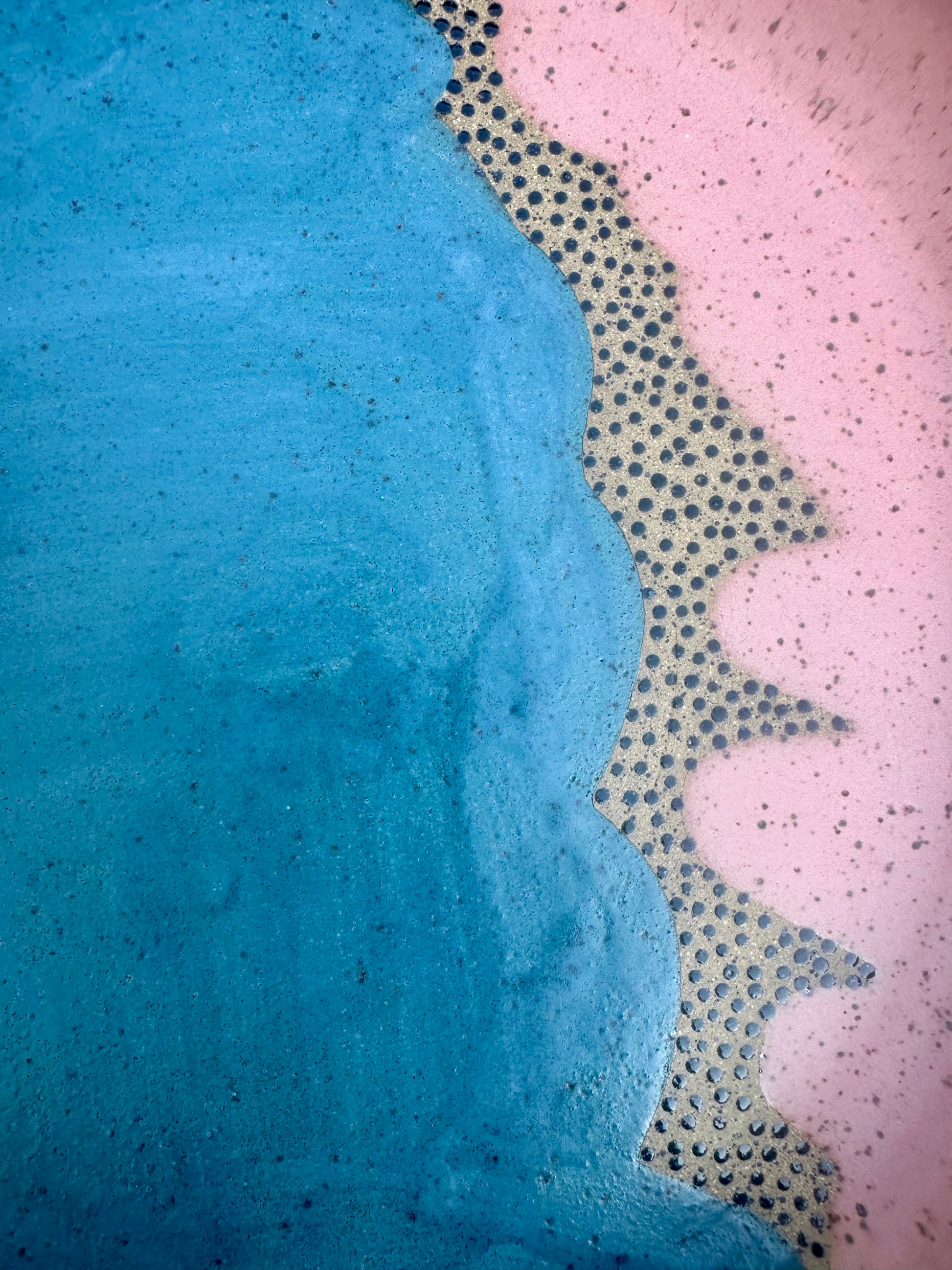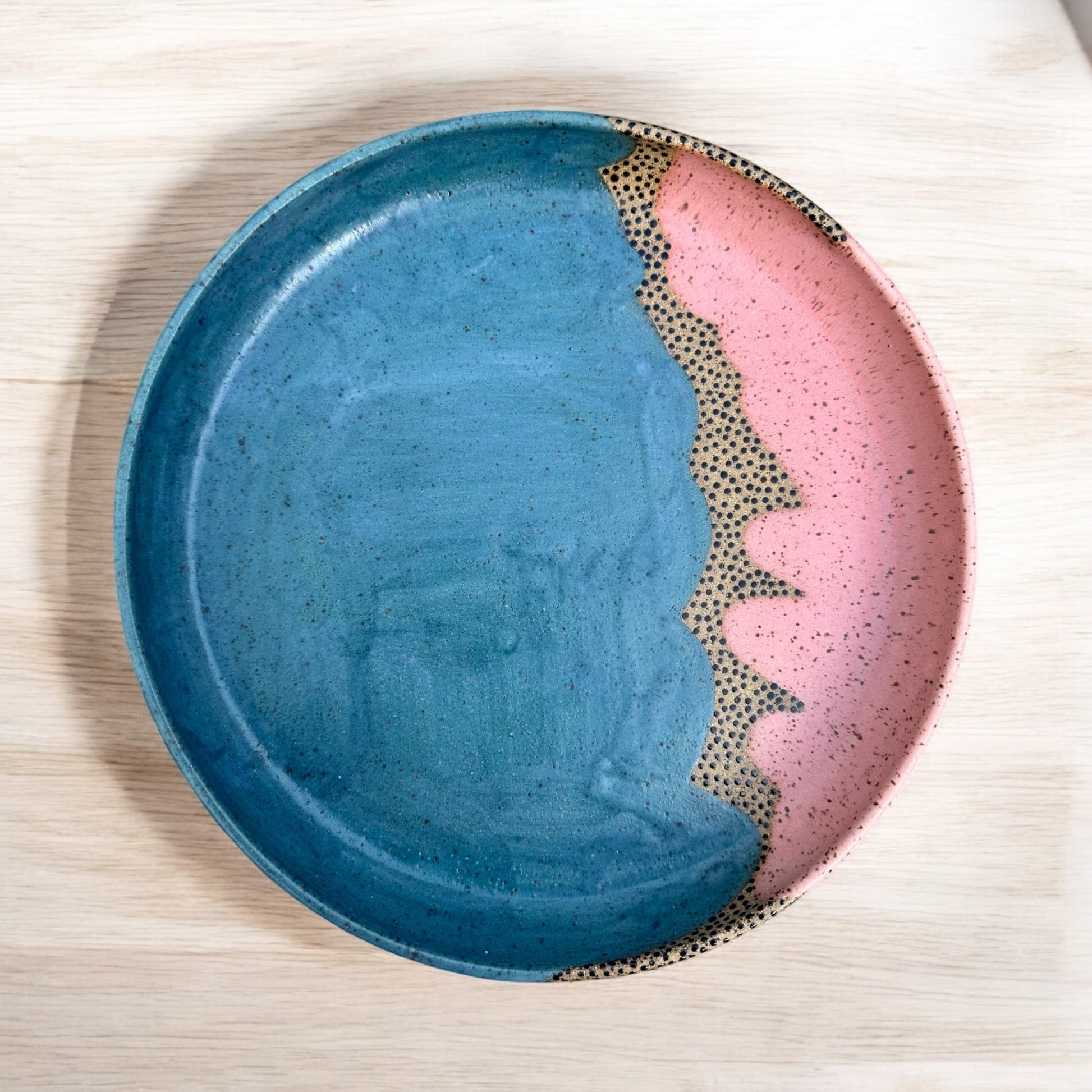 Wheel-thrown plate with hand-built tripod feet in brown speckled stoneware. Aqua Matte and Coral Satin Glazes combine to create organic designs in this one-of-a-kind serving dish.