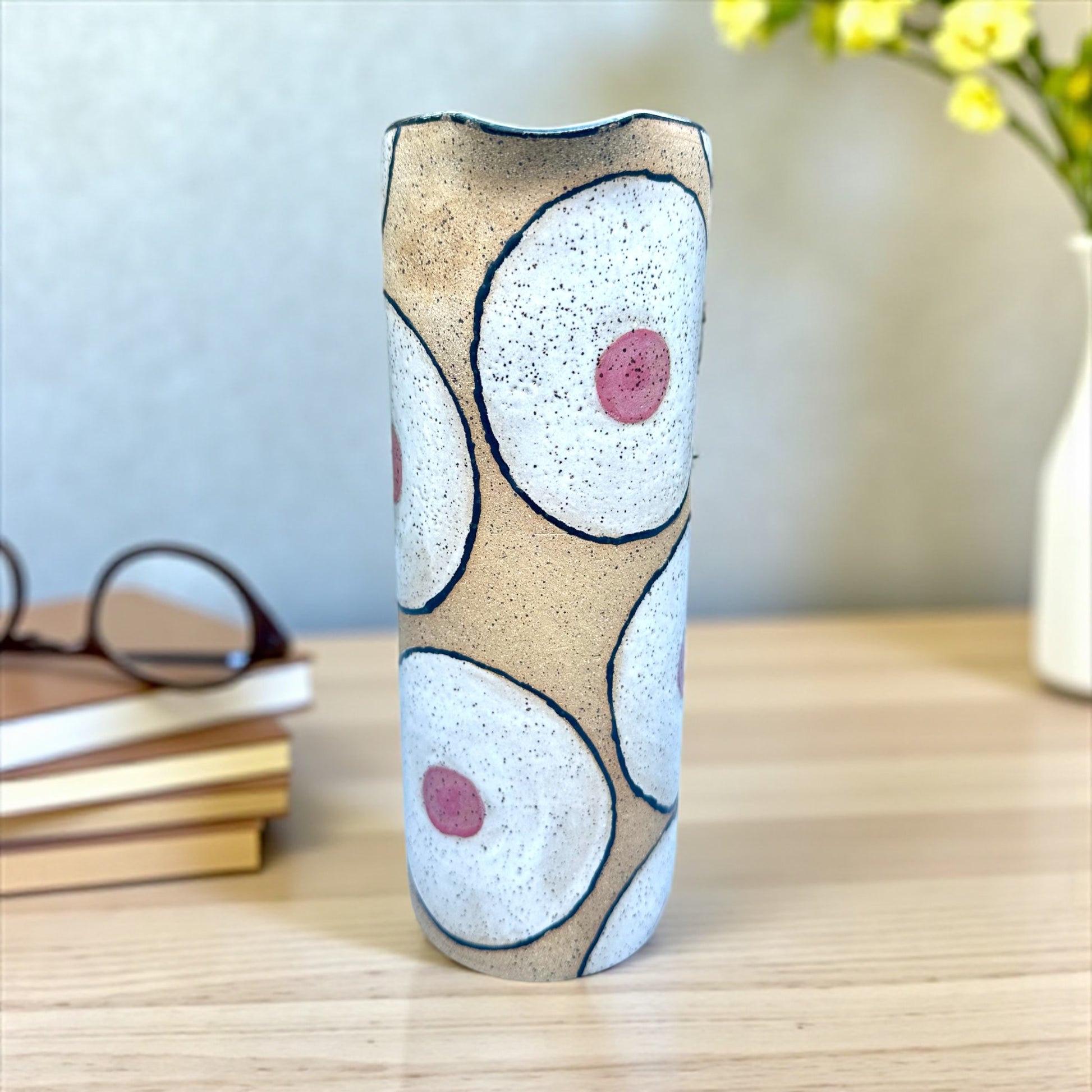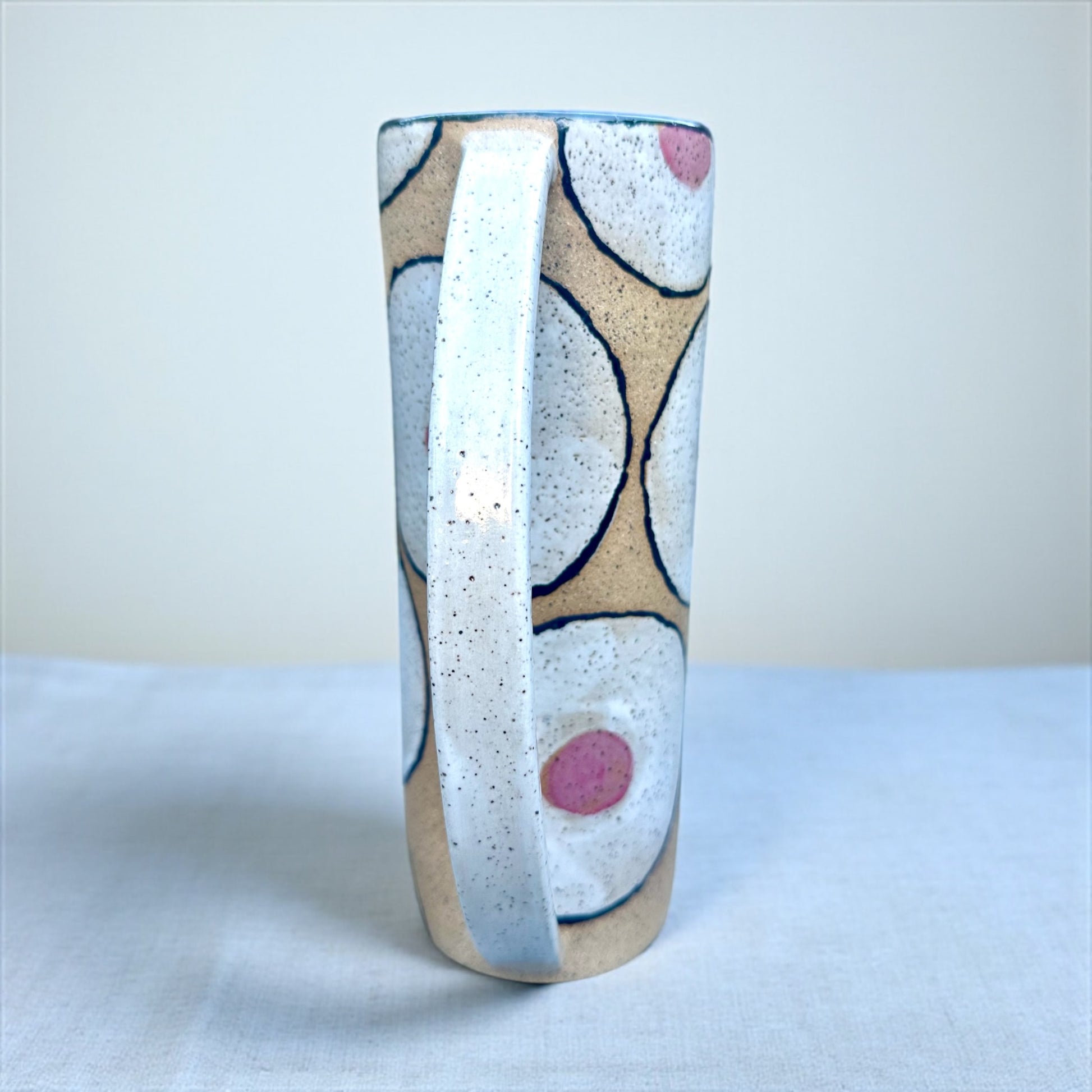 Wheel-thrown in speckled brown stoneware. This tall, hand-painted pitcher features a playful, modern design with bold circular patterns in soft pink and white against a natural clay body. The organic shapes and speckled texture add warmth and charm, making it perfect for serving drinks or displaying flowers.