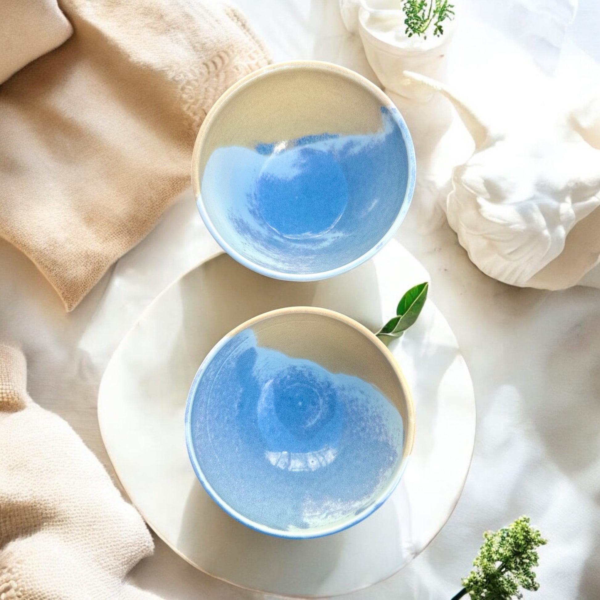 Wheel-thrown in porcelain stoneware. These vibrant salad bowls combine Sunshine Yellow and Sky Blue gloss glazes into a natural seascape design. Matching serving plate available!