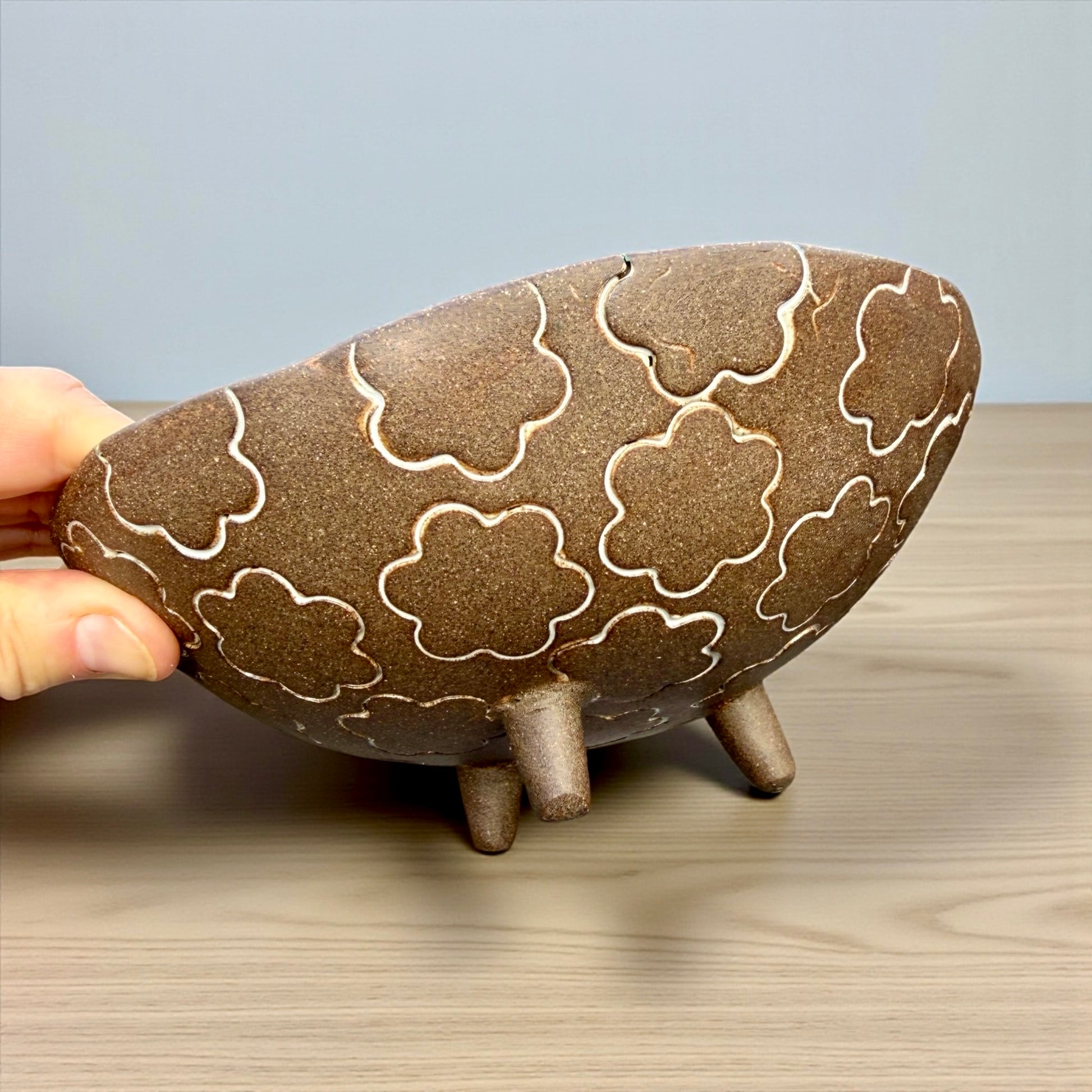 These hand built tripod bowl sets are made from dark speckled clay and colored slip (liquid clay). Stamped designs on the underside adds some playfulness and whimsy to the chocolate brown clay body. These sets are wonderful holiday gifts and/or a perfect "something special" for home.
