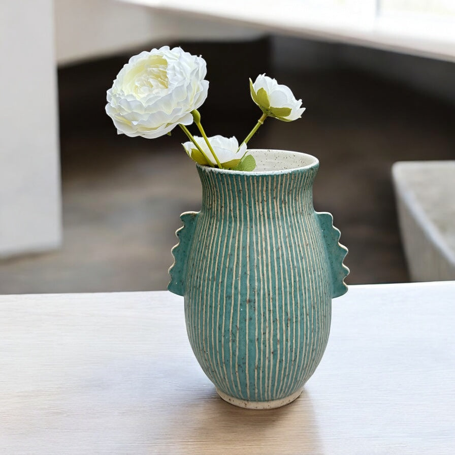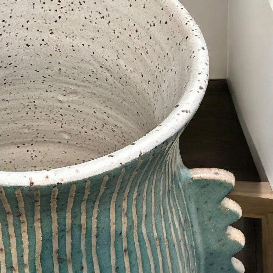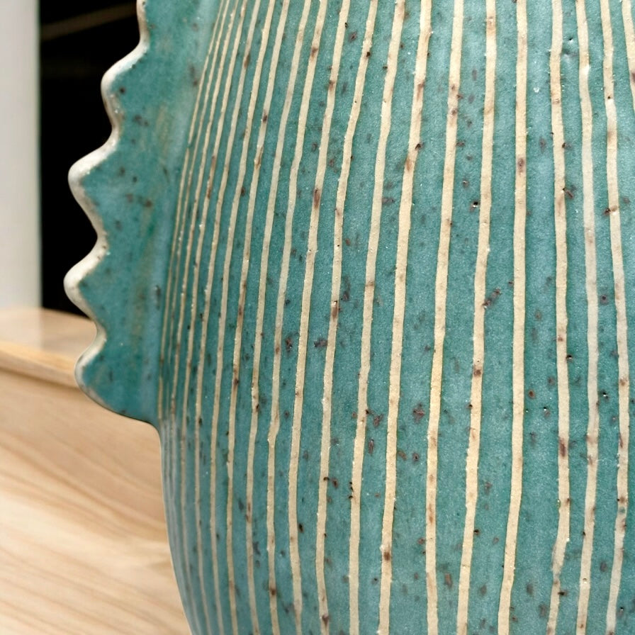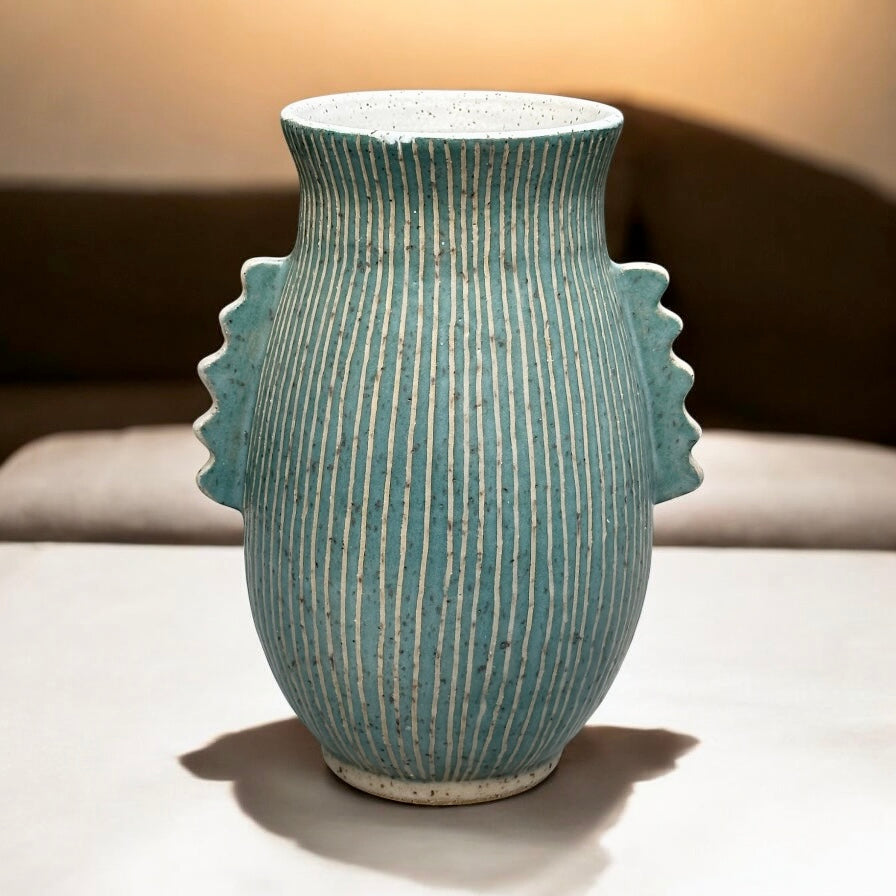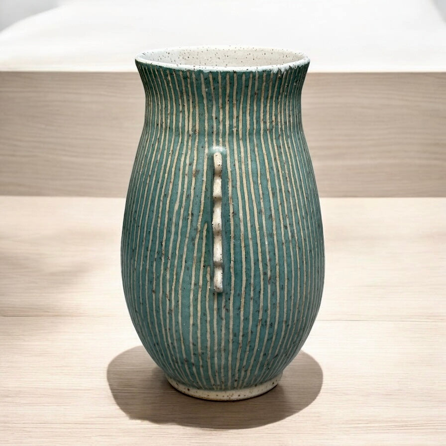 Wheel-thrown in speckled brown stoneware. Hand-carved designs in Aqua colored slip (liquid clay). The interior is a satin matte White glaze. This piece make a beautiful wedding, birthday and/or anniversary gift. But if your feeling a little self indulgent, enjoy it as a special "just for me" centerpiece any where in your home.