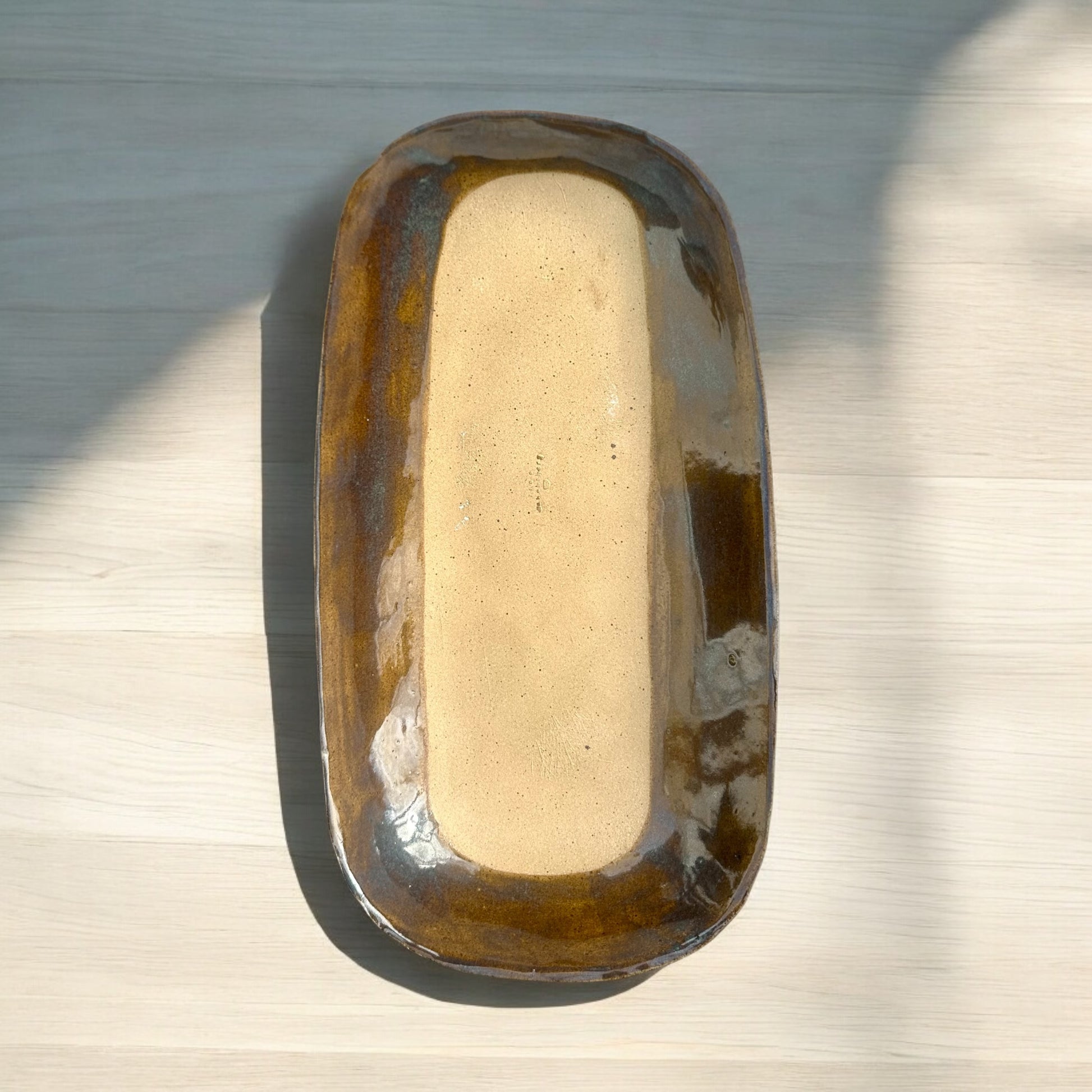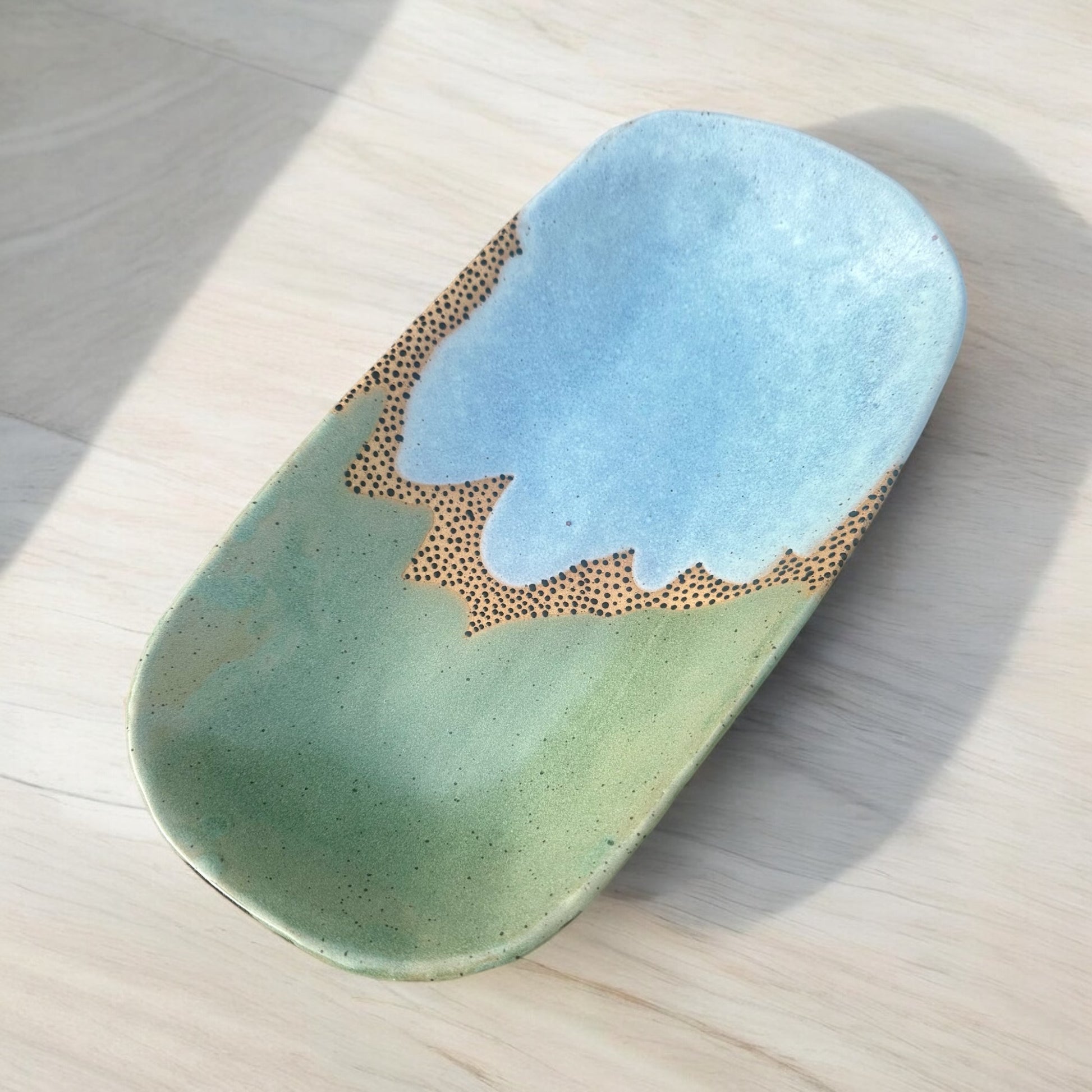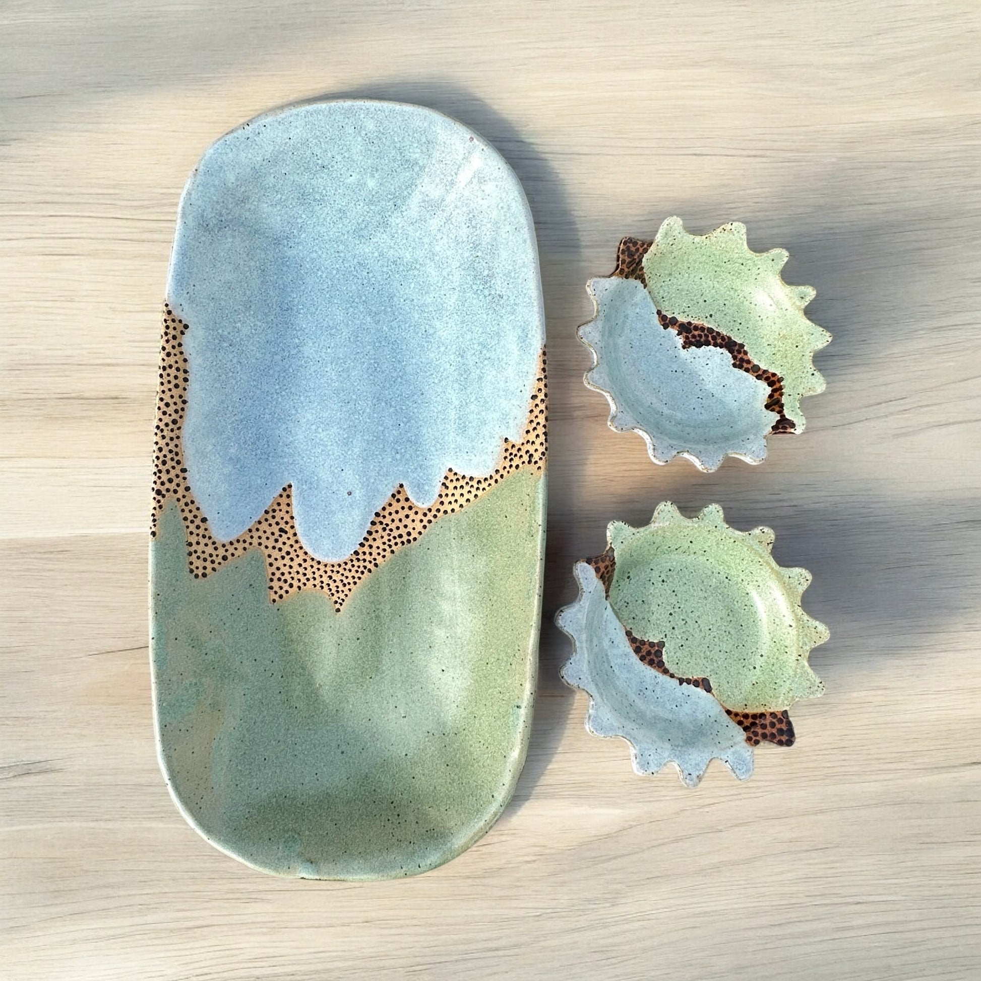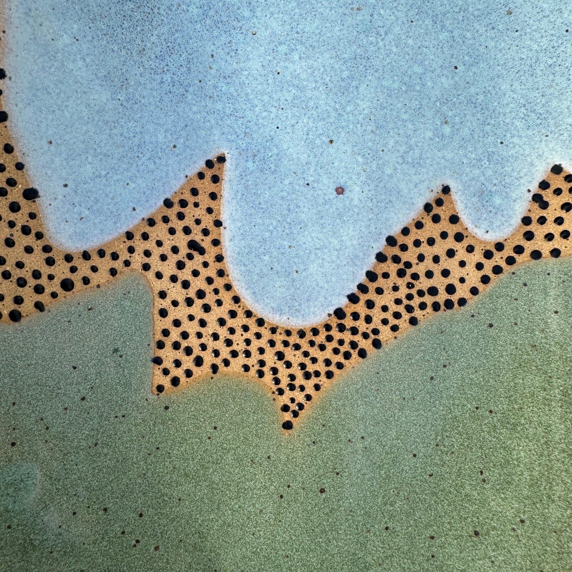 Hand-built in speckled brown stoneware. Basque Green and Misty Blue are hand-designed with matte Black accents to create a retro-modern oval serving dish. Exterior is Blue Tiger Eye shiny glaze.